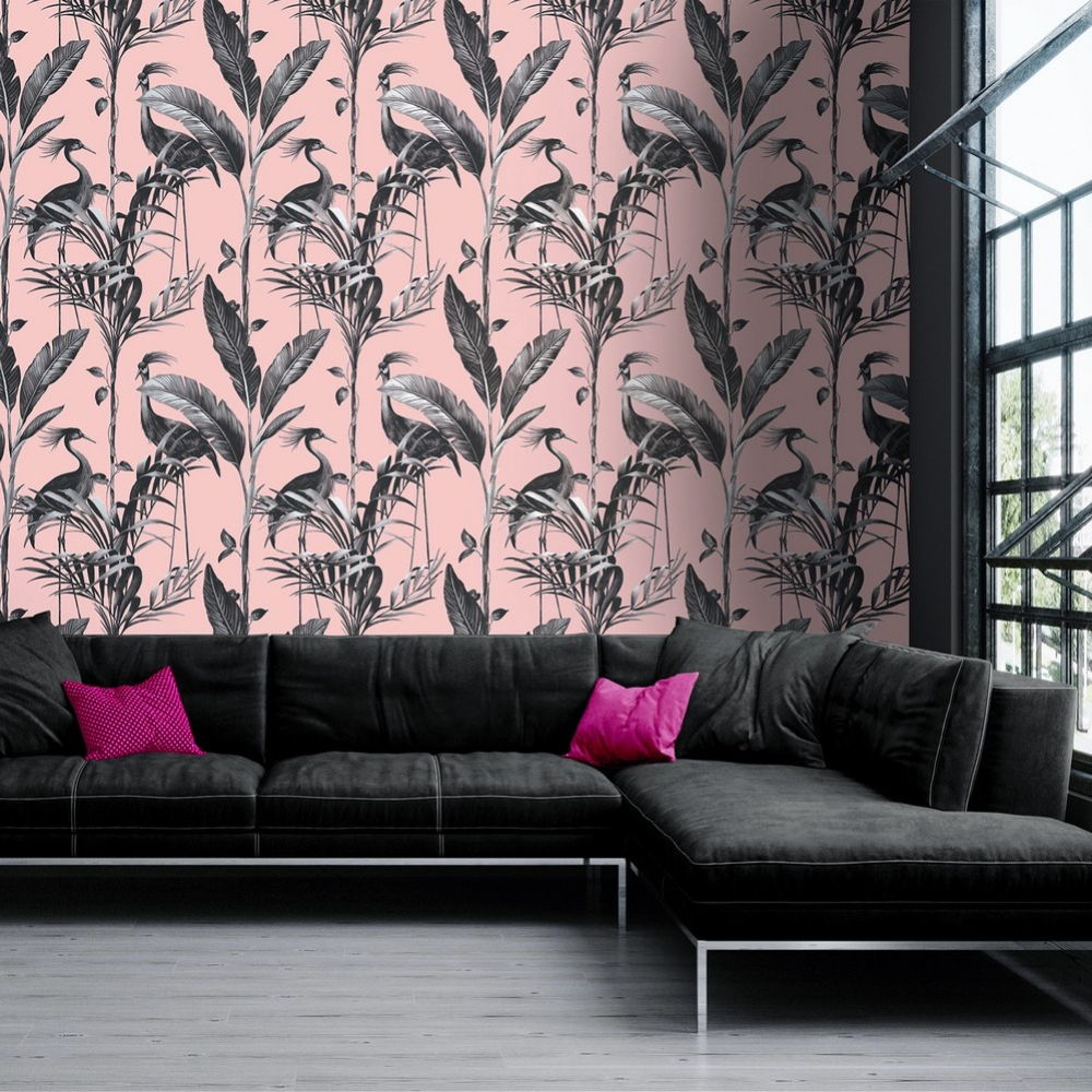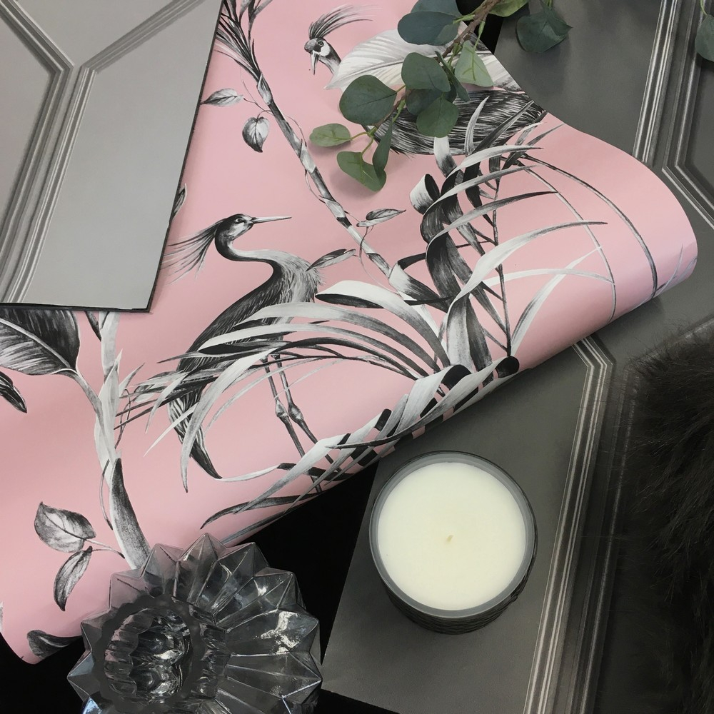 Bold, adventurous striking wallpaper from Belgravia Decor's Azzurra Collection. Modern pink background and delicate foliage bird pattern. Perfect for creating a feature wall for any room in your home.