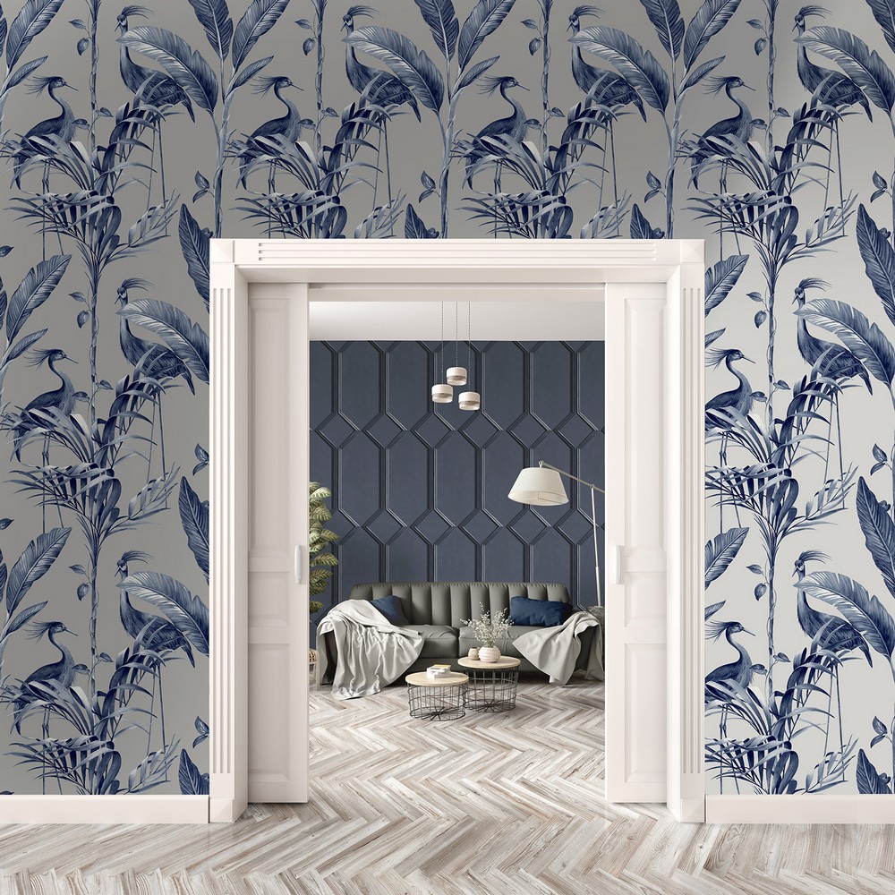 Bold, adventurous striking wallpaper from Belgravia Decor's Azzurra Collection. Modern metallic silver background and delicate foliage bird pattern. Perfect for creating a feature wall for any room in your home.
