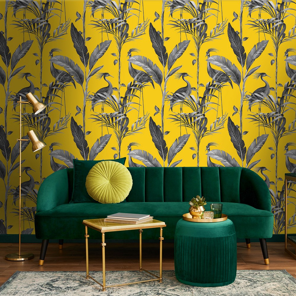 Bold, adventurous striking wallpaper from Belgravia Decor's Azzurra Collection. Modern yellow background and delicate foliage bird pattern. Perfect for creating a feature wall for any room in your home.