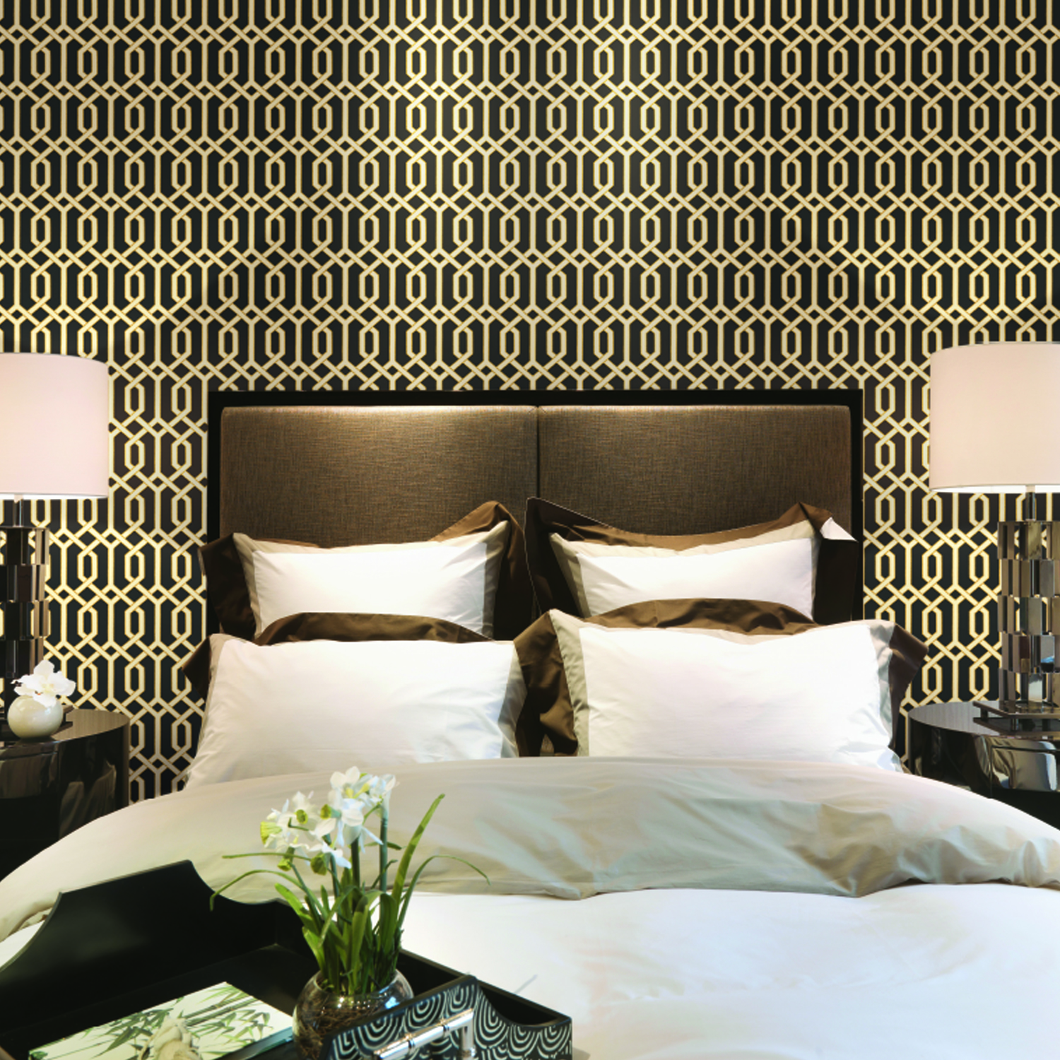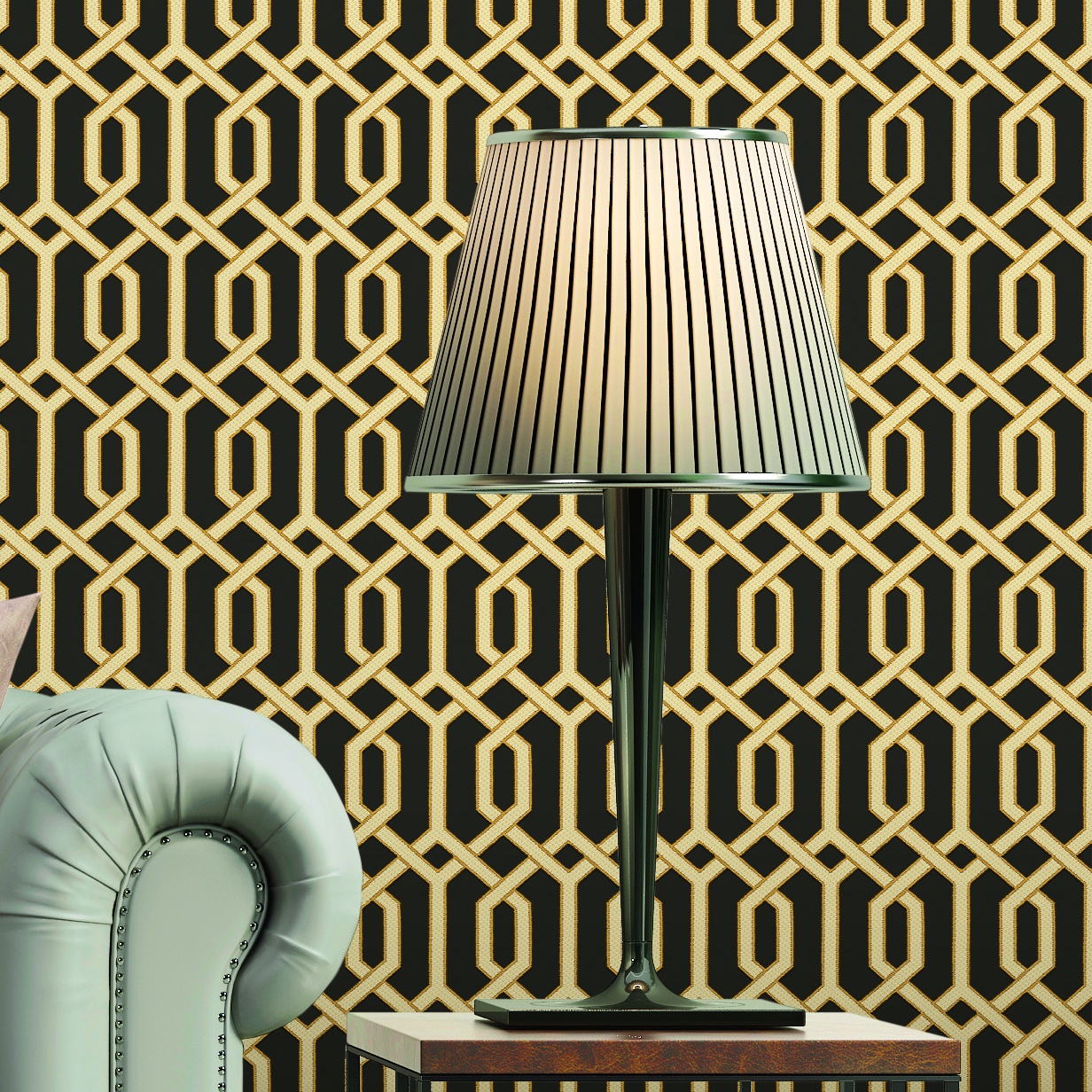 Calculate QuantityThis opulent Beaux Geometric design makes a beautiful addition to any room. Introducing a modern yet regal feel into you room using contemporary textures and subtle metallic inks, this is perfect for an eye-catching feature wall or for an all-round stunning full room look. Shown here in black, please purchase a sample for true colour and texture.
