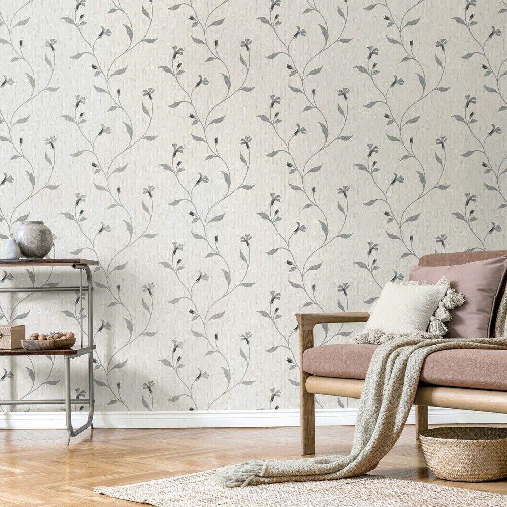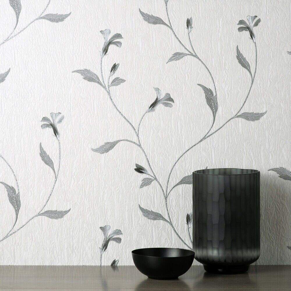 Calculate QuantityA lovely Italian-style vinyl wallcovering with a trailing silver flower embroidered pattern and a fabric-like texture backdrop. Seen here with a shine going across the texture and a white backdrop. Other colours are offered. Matching paper: Bellagio Texture M95636 in harmony. To get a genuine feel for the paper please order a sample.