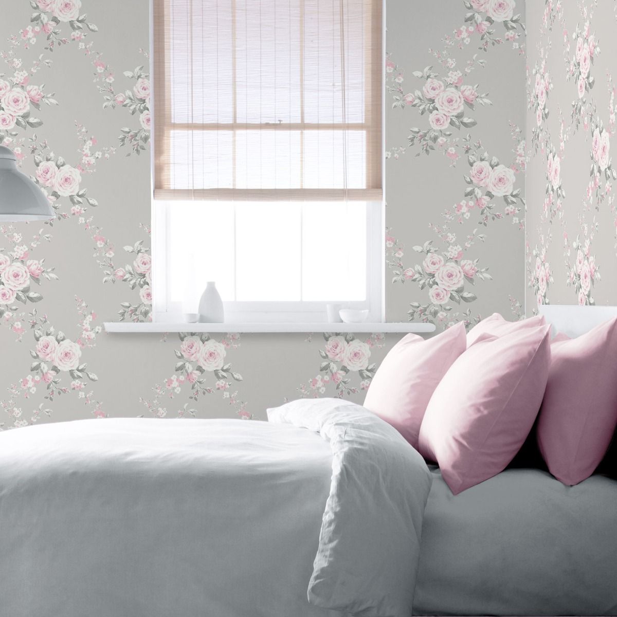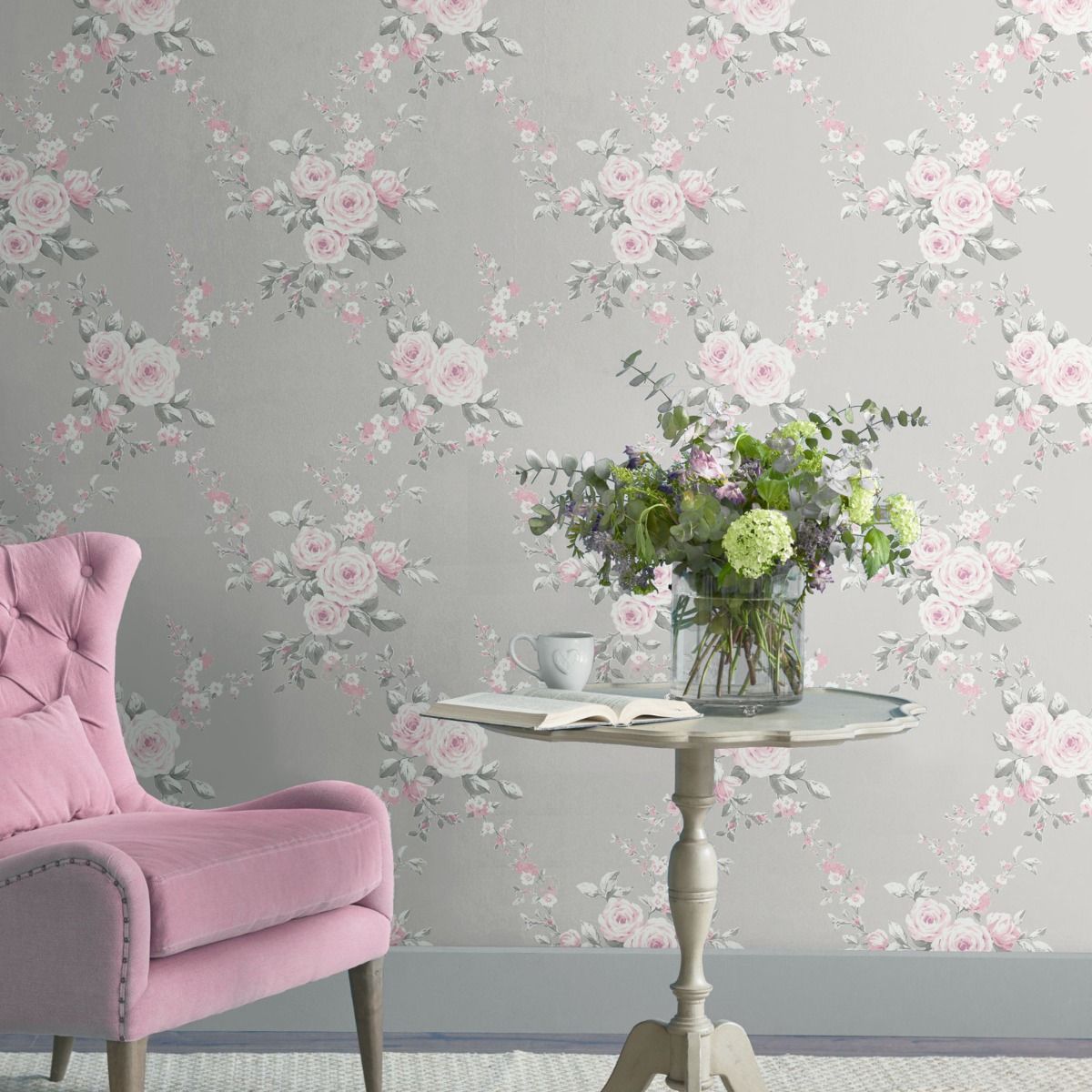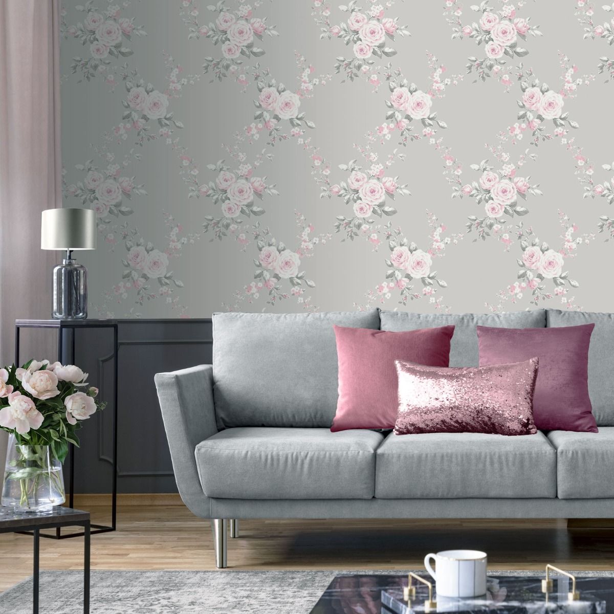 Catherine Lansfield Floral Grey Pink Wallpaper 165503