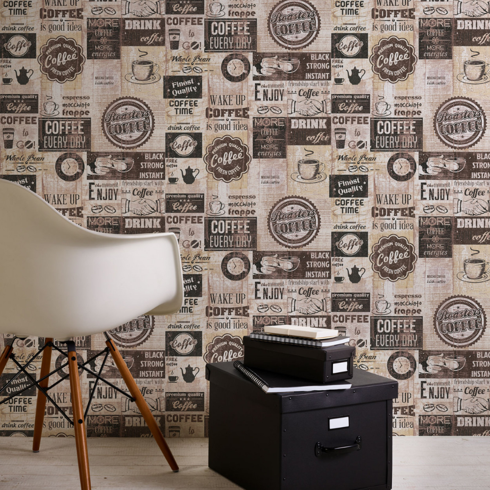 A vintage Coffee Shop wallpaper from AS Creation, Quirky and Unique. Available in other colours, please purchase a sample for true colour and texture