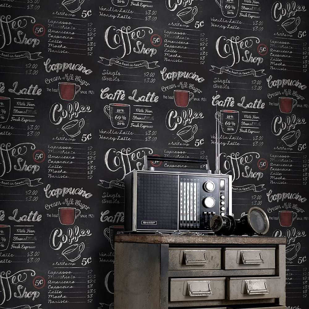 Calculate QuantityQuirky Coffee Shop Blackboard Wallpaper by Rasch offers an unusual feature wall option. This design includes a range of drink options, signage and illustrations usually found in trendy coffee shops. The design shows a realistic blackboard effect to your walls and would work well in dining areas.