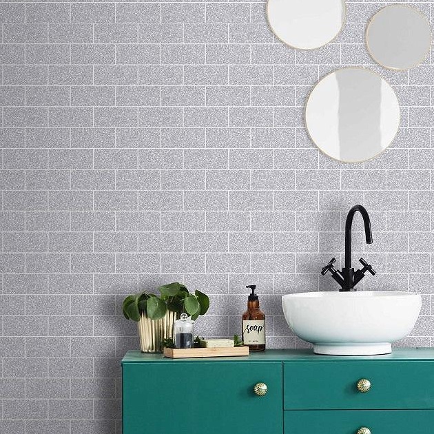 Calculate QuantityWith stylish colour and glitter this tile effect creates a fabulous stand out effect. The heavy weight vinyl backing makes this perfect for Kitchen and Bathroom, but be used to create a modern industrial look in any room. Please purchase a sample for true colour and texture.