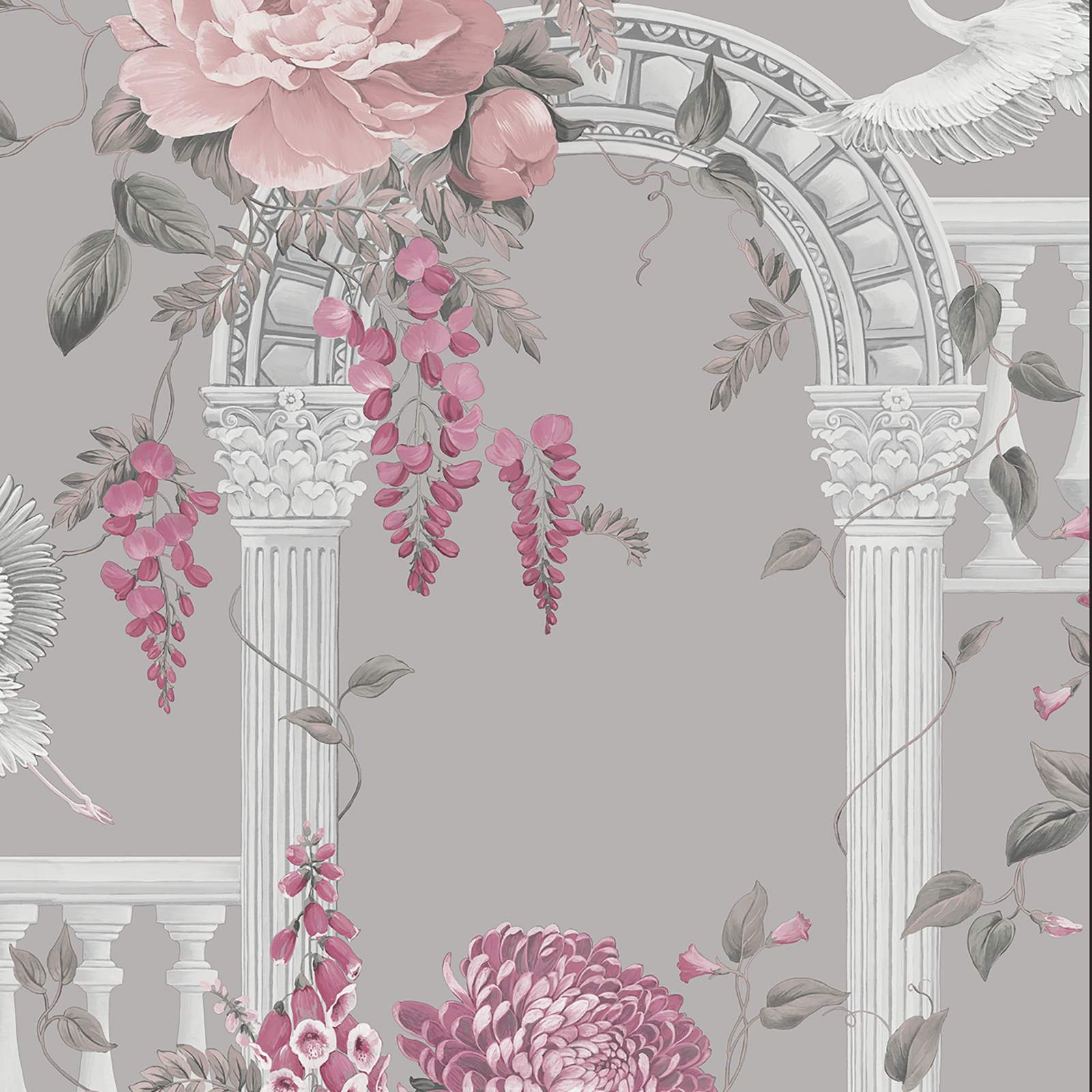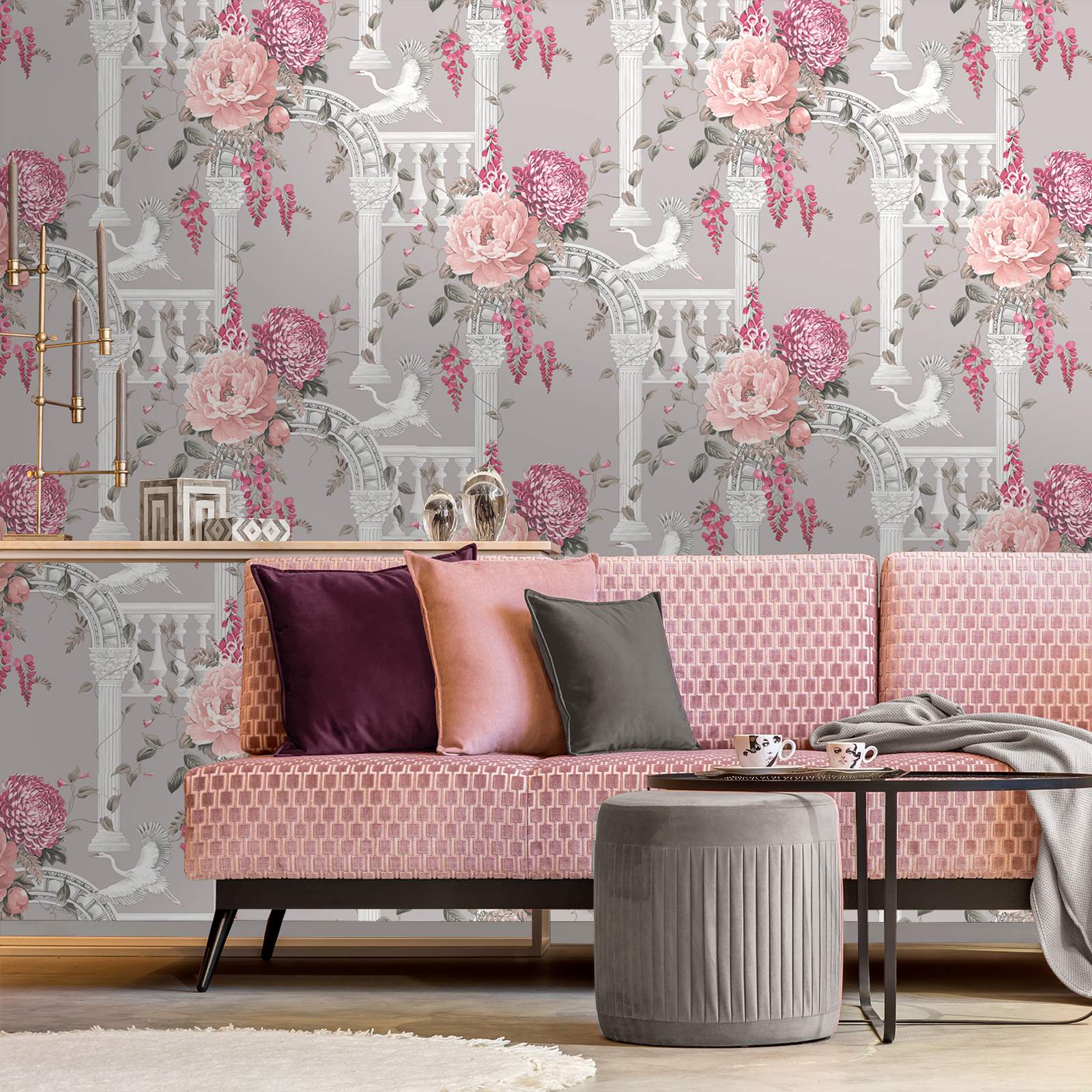 Calculate QuantityThe stunning Corinthia Archway Wallpaper will bring a sophisticated touch to your house. Large pink-hued flower patterns and elaborate Corinthian-style columns and arches with grey vines intertwined around them are included in the design. This has a smooth matte feel and is set on a soft grey background. This high-quality wallpaper is simple to install and will look wonderful whether it is used to create a focal wall or to adorn an entire room.