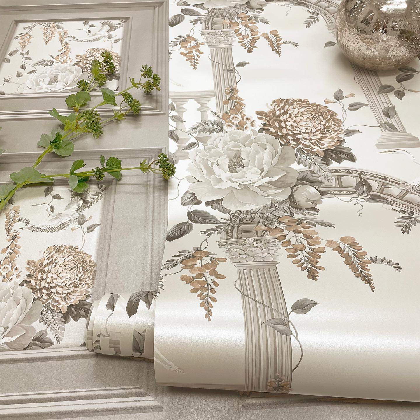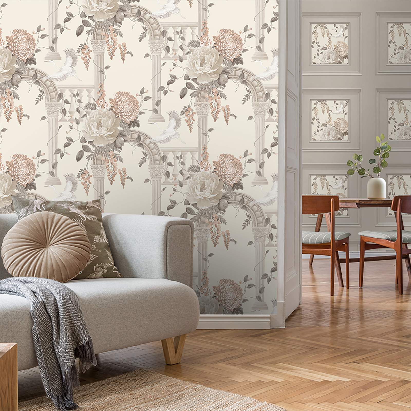 Calculate QuantityThe stunning Corinthia Archway Wallpaper will bring a sophisticated touch to your house. Large floral patterns in beige and cream, as well as grey and white cranes, are used as accents on the design's elaborate Corinthian columns and arches. This has a pearly sheen finish and is placed against a gentle cream backdrop. This high-quality wallpaper is simple to install and will look wonderful whether it is used to create a focal wall or to adorn an entire room.