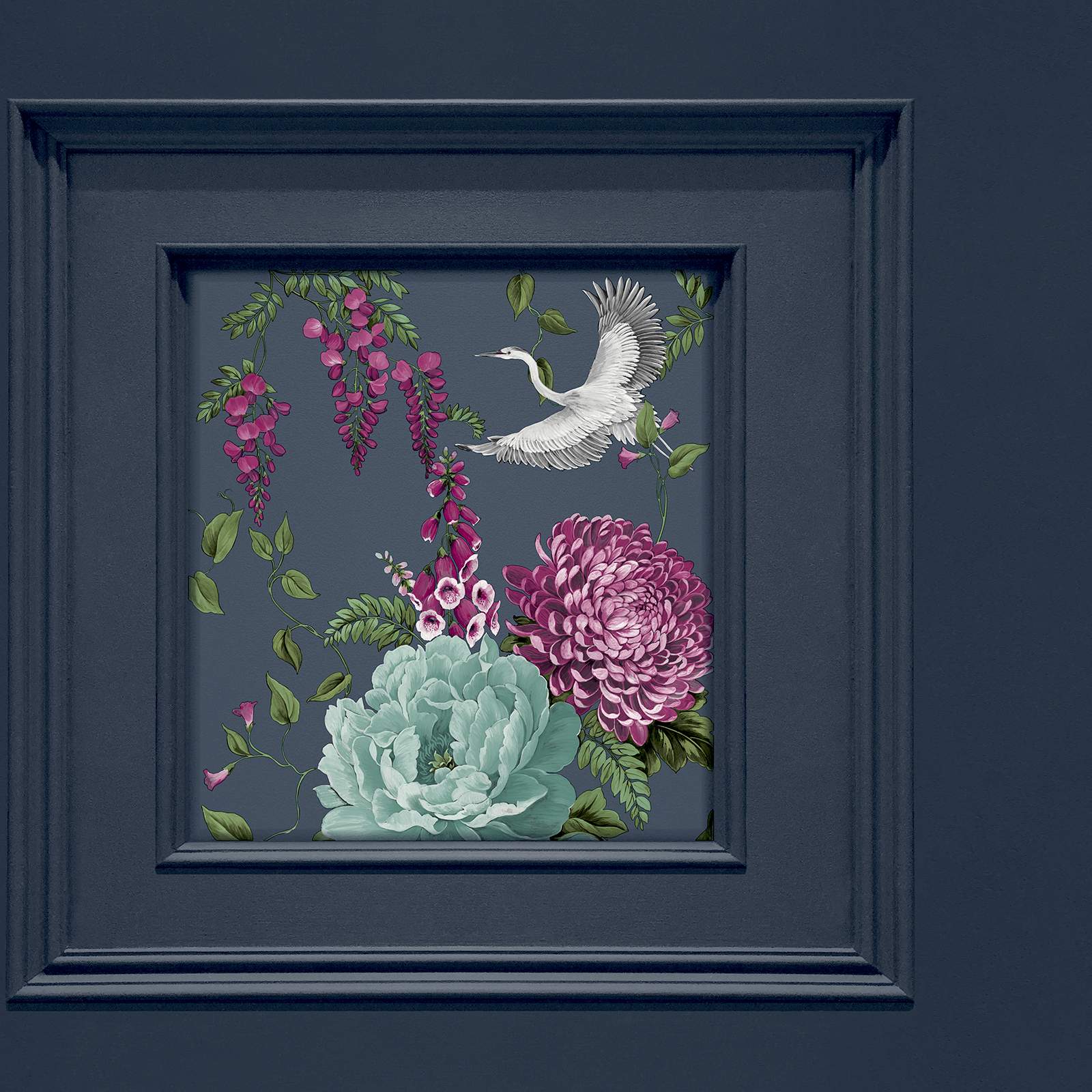 Calculate QuantityThe stunning Corinthia Panel Wallpaper will give a touch of class to your house. Large wood panels in dark blue tones serve as the design's foundation, and creative shading techniques are used to produce a striking 3D illusion. The centre of each panel features hand-painted-looking grey and white cranes with purple, blue, and green flowers and foliage. This premium wallpaper is simple to hang, has a matte surface, and looks excellent when used to accent a wall or to adorn an entire room.