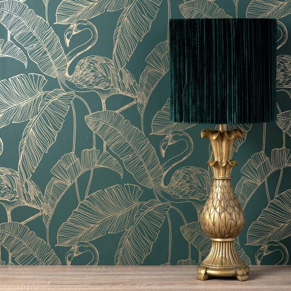 Flashy Flamingo Emerald Green & Metallic Gold Wallpaper FD42946