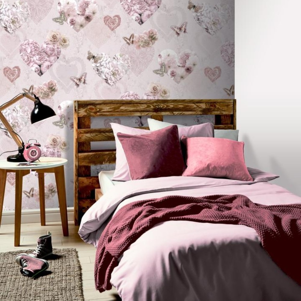 Calculate QuantityA bold heart wallpaper design in feminine pink tones. The hearts are filled with pretty floral and butterfly motifs that are enhanced with glitter gel that catches the light beautifully bringing a glamorous touch to any wall. The background of this wallpaper design is filled with soft pink and grey motifs that soften the look. Choose it for a bedroom, living room or dining room to bring a touch of romance to your home. Suitable for most rooms except high moisture environments, like bathrooms.