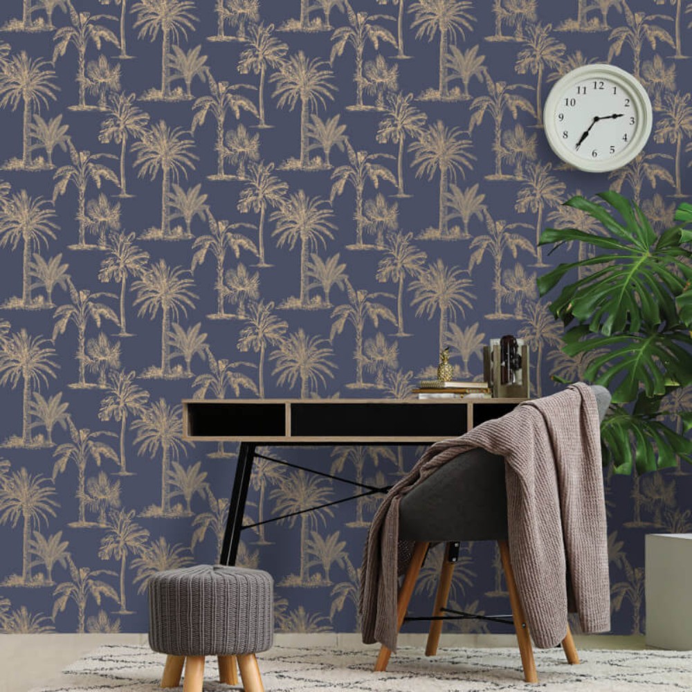 Glistening Tropical Tree is a stunning palm tree wallpaper. It features an intense metallic soft gold tree print on a matt navy background.