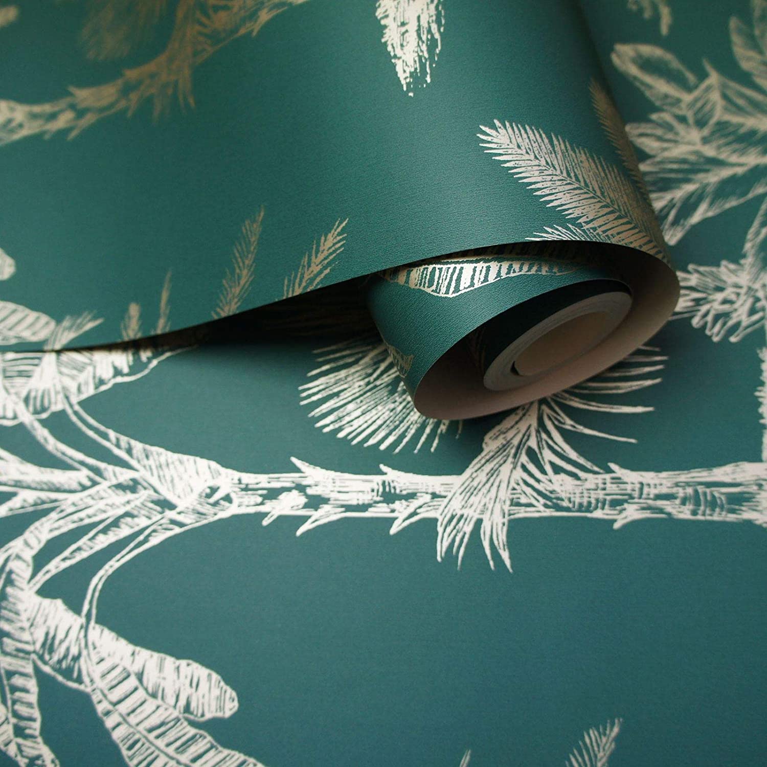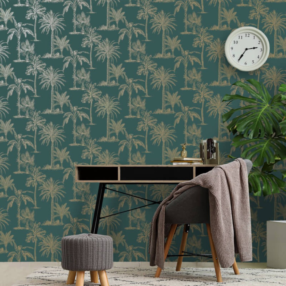 Glistening Tropical Tree is a stunning palm tree wallpaper. It features an intense metallic soft gold tree print on a matt teal background.