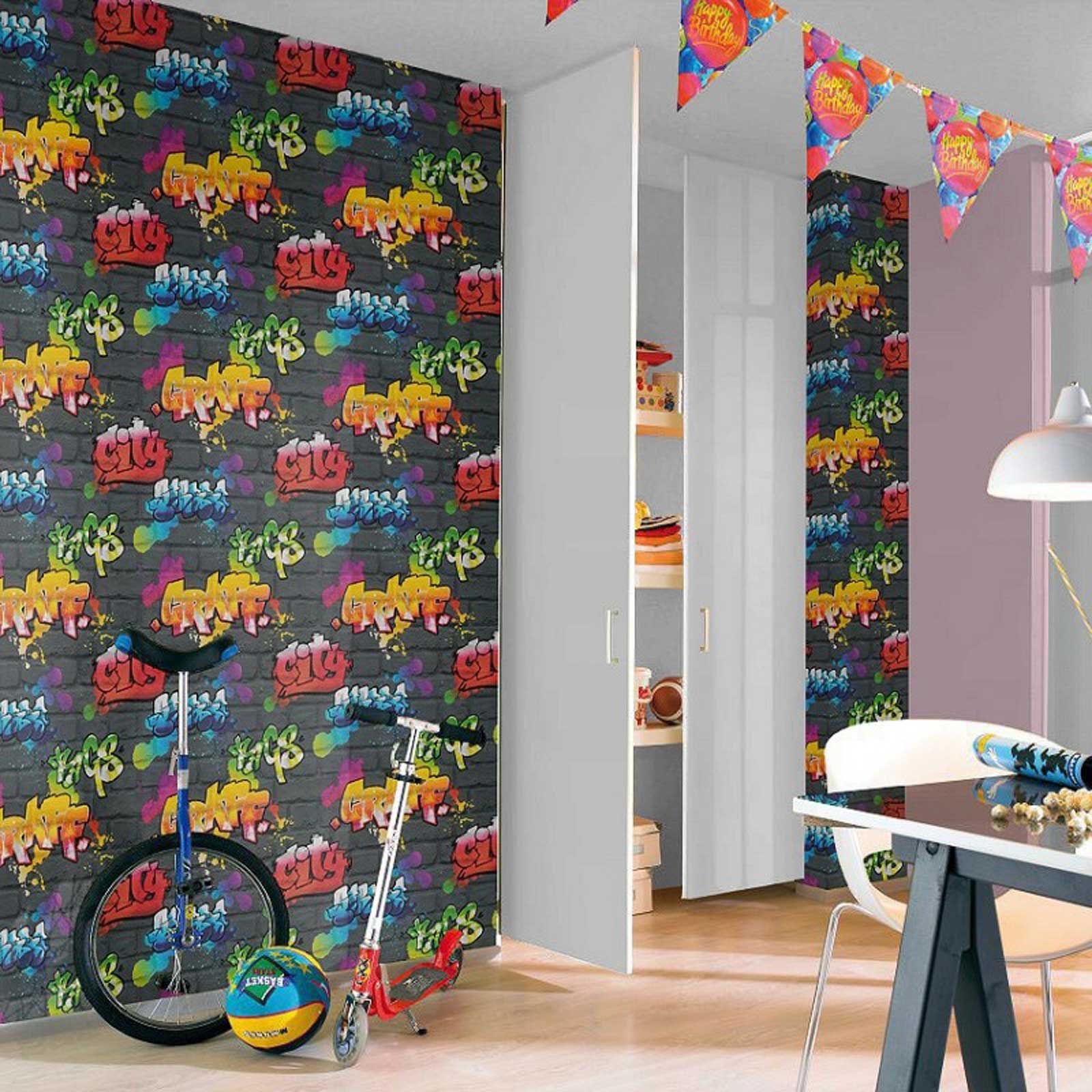 Brick by brick, this wallpaper creates industrial chic with a used look. The graffiti brickwork features a 3D design and is marked with stylistically authentic traces of wear. This wallpaper makes a room unique without needing to a spray can.