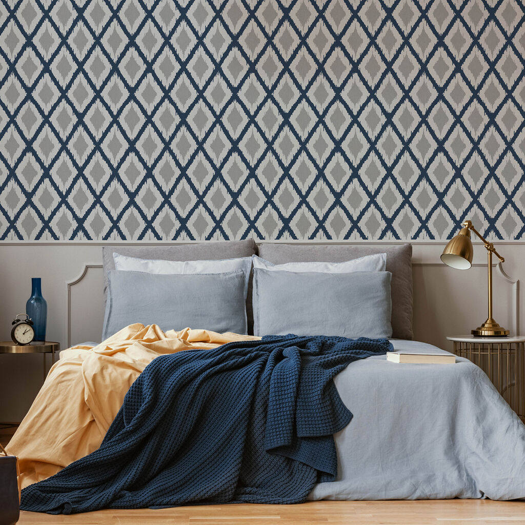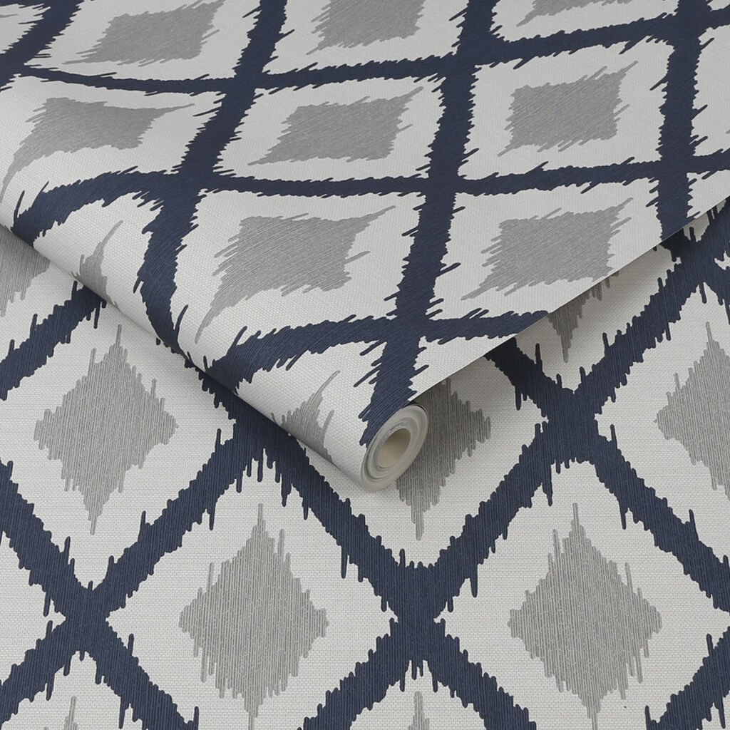 This stunning Ikat wallpaper features an on-trend geometric pattern with a beautiful blue colour scheme. Perfect for feature walls, please purchase a sample for true texture.