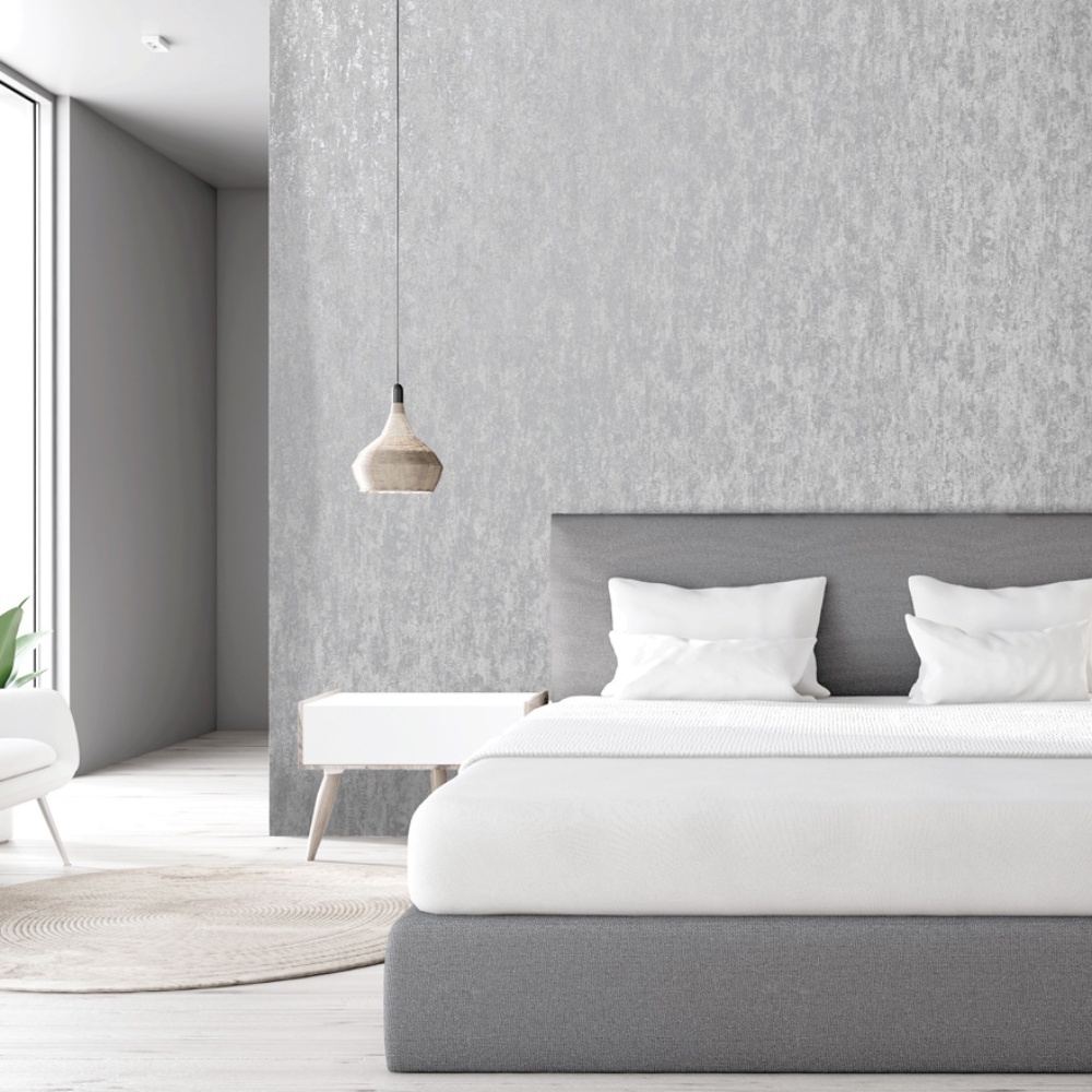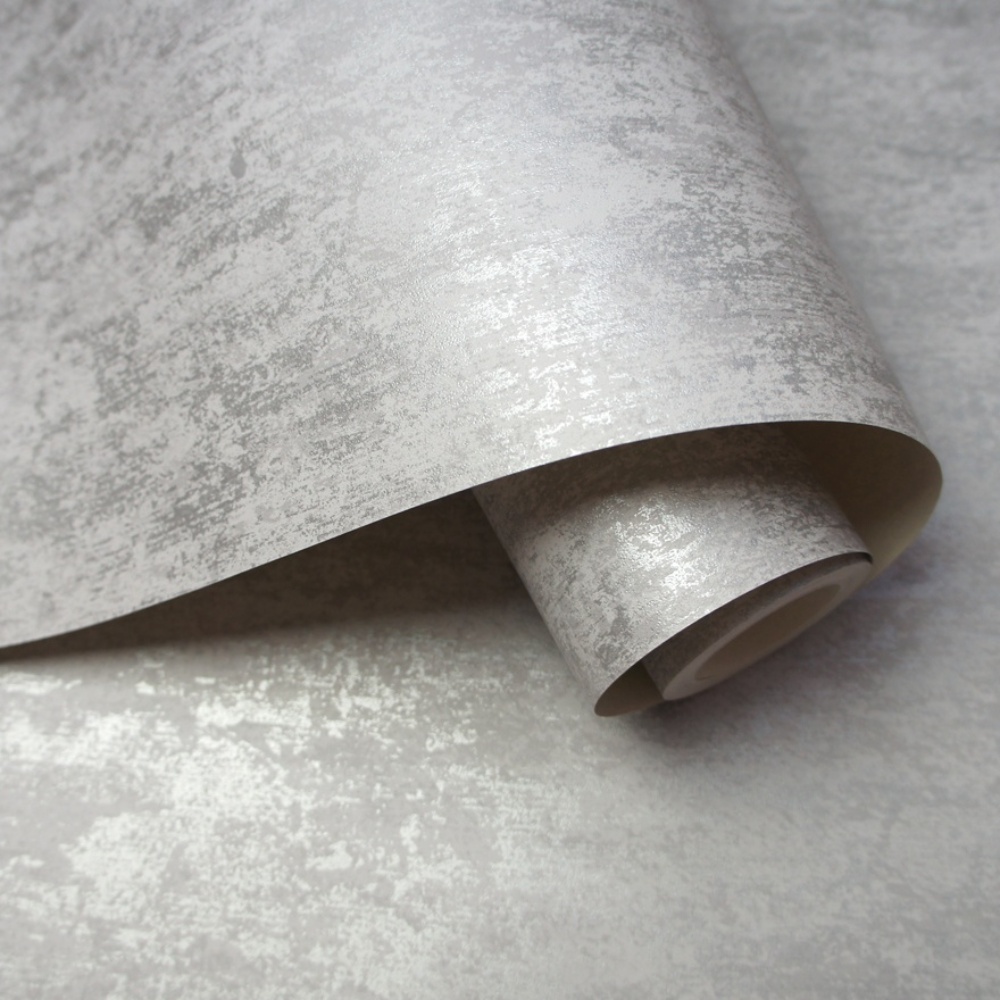 This industrial wallpaper features a distressed print of metallic silver and tones of grey to create a contemporary, industrial appearance.