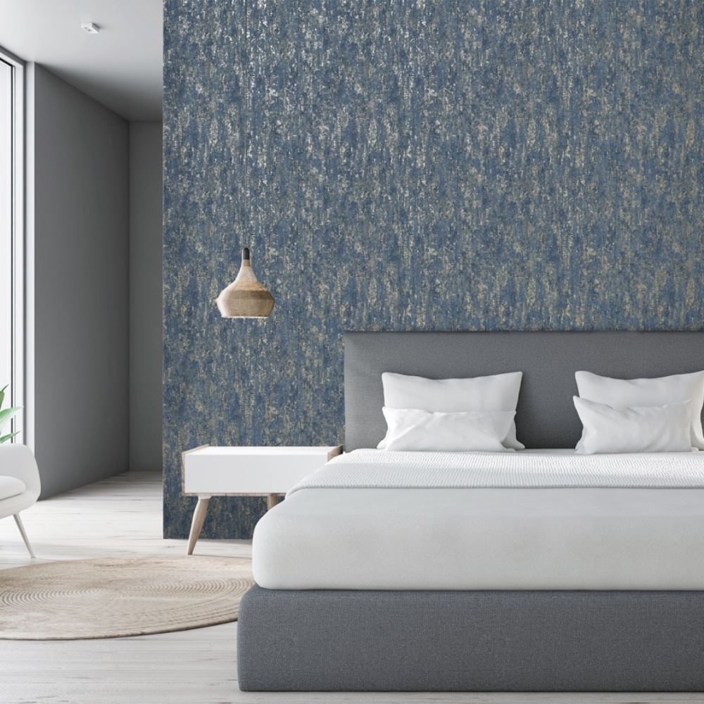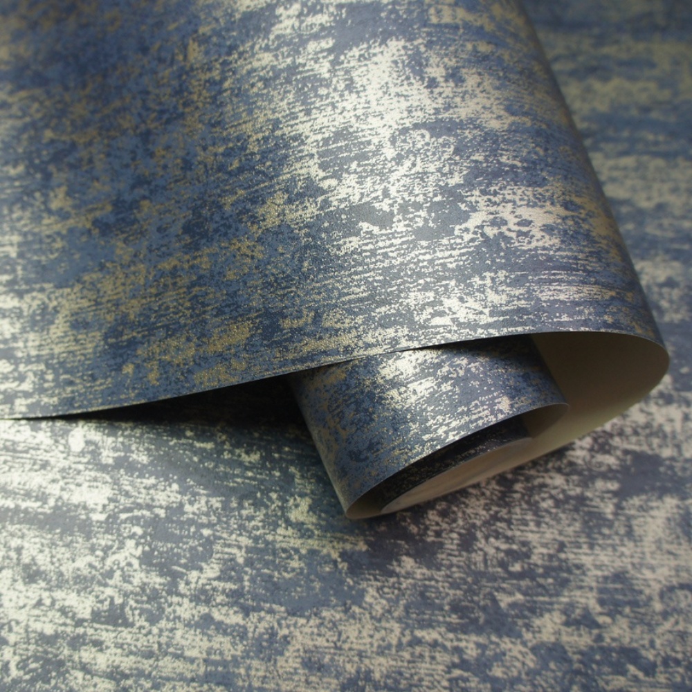 This industrial wallpaper features a distressed print of metallic soft gold and tones of navy blue to create a contemporary, industrial appearance.
