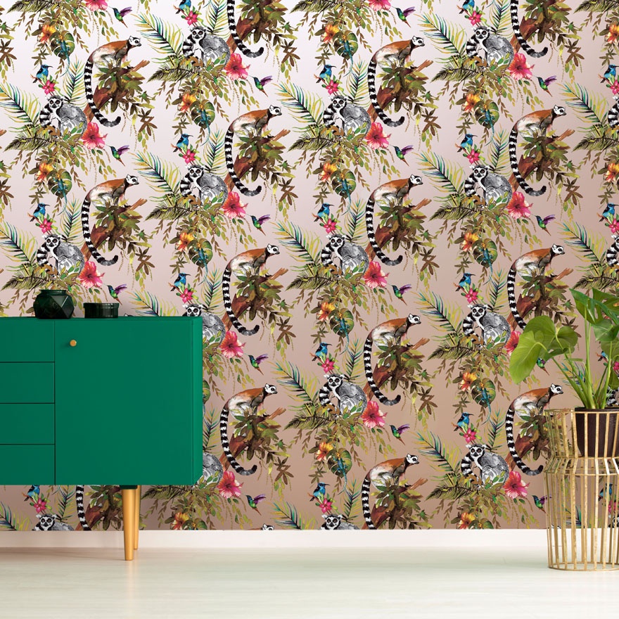 Lemur features a collection of detailed illustrated style lemurs with colourful hummingbirds and tropical flowers in beautiful vibrant colours on a metallic rose gold background.
