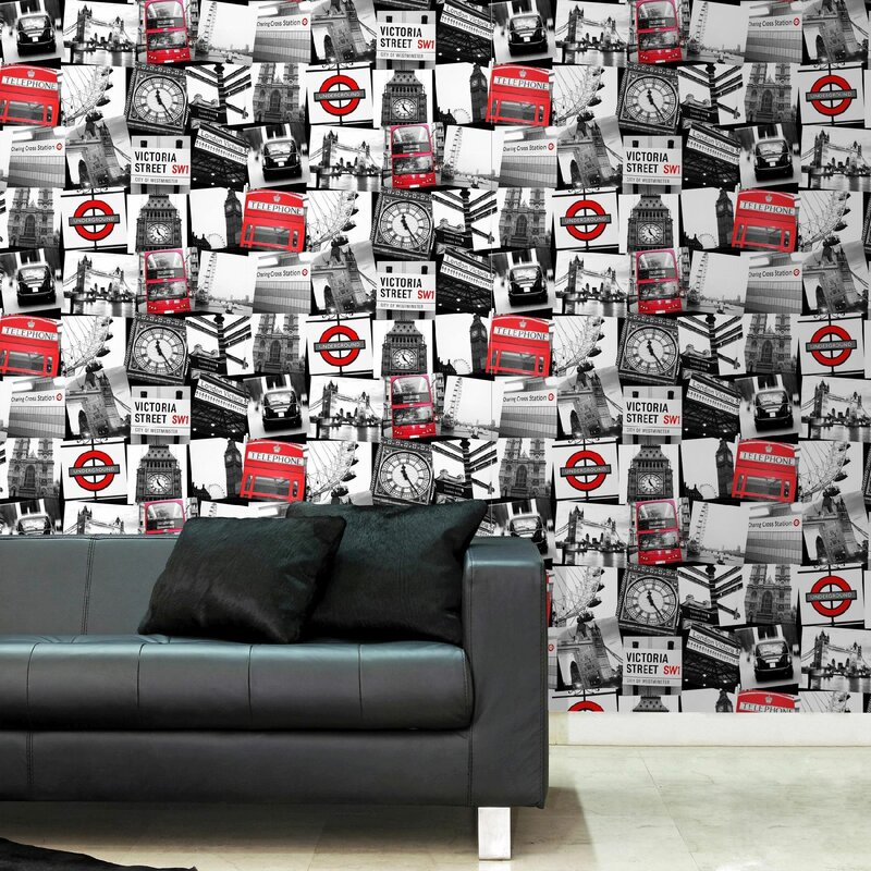 London Montage wallpaper is the perfect design for those who love the UK and images and signs associated with the it's capital city, full of the iconic landmarks of London this is a dramatic design that will be a real talking point of any home.