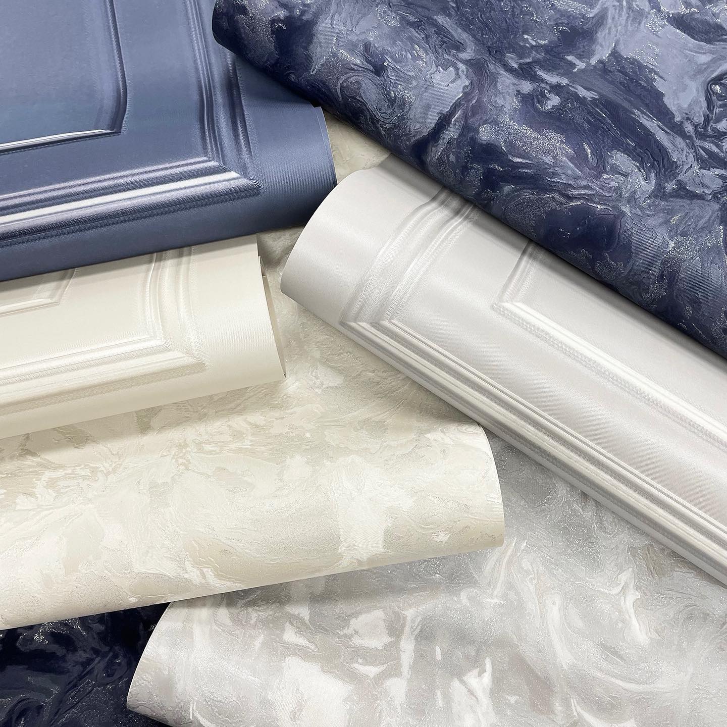 Another lovely, luxury wallpaper from Belgravia Decor. This Marble inspired pattern displays lovely shades of silver and grey which has intricately created a silk texture effect. Shown here in Navy blue. Please purchase a sample for true texture.