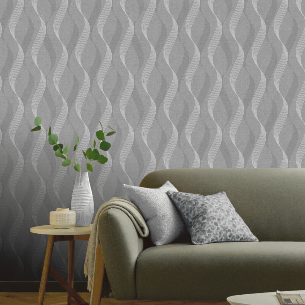 Calculate QuantityDefinitely an eye catcher, this wave design wallpaper contrasts textures and finishes to bring depth and style to your room. With a charcoal grey matt textured background and wavy patterns enhanced with silver metallic and glitter finishes, this wallcovering will transform a room in a chic and contemporary way. A heavy weight vinyl wallcovering that is not only tough and hardwearing, it will also cover slight imperfections on your walls, so Its a great option for high traffic areas of the home.