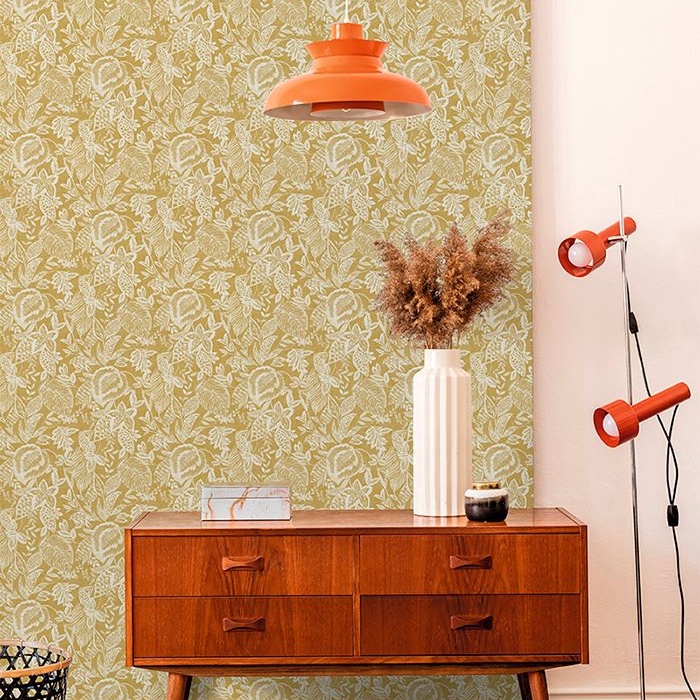 Grandeco Mae wild ochre wallpaper from the Nomad collection. This linen style wallpaper features an assortment of tropical foliage on a ochre background. This design is perfect for creating a vibrant feature wall without overdoing it.
