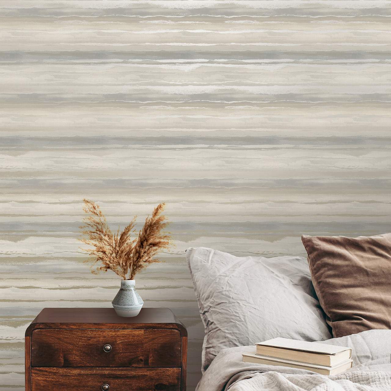 Calculate QuantityHorizon Mirage wallpaper from The Design Library's Elegant Homes collection adds a calm vibe to the space. The centrepiece of the design is a sweep of lines that resembles the setting sun and is completed in a contemporary mix of metallic and matt elements. Produced by Rasch UK for The Design Library; seen here in Natural.