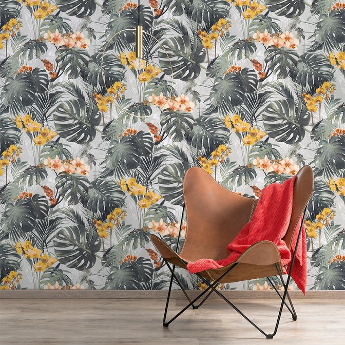 A layered digital design with jungle leaves and bold orchid flowers with an all over weave texture. Shown in the green with orange and gold flowers. Please purchase a sample for true colour and texture.