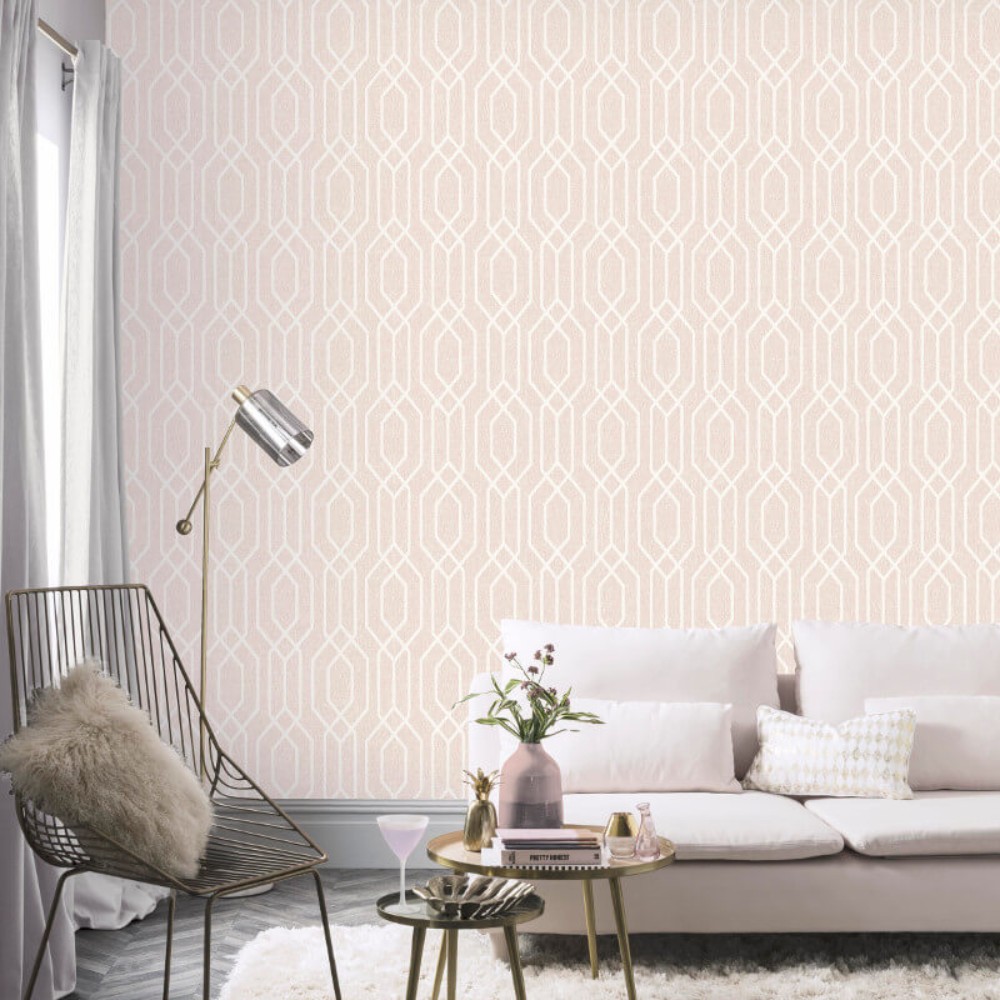 Fine intricate lines create a beautiful geometric motif on this easy-living wallpaper design. This soft pink wallpaper will complement beautifully any modern decor.