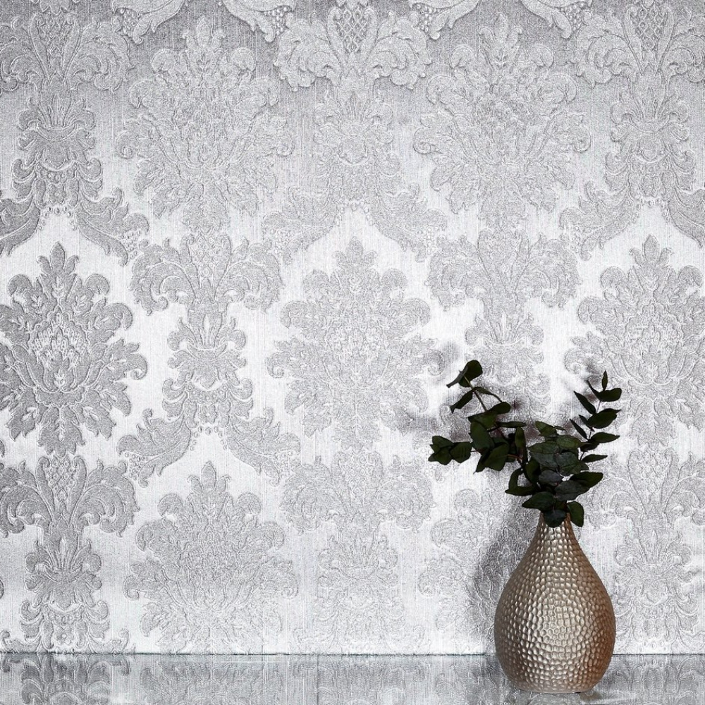 Calculate QuantityOpulence Silver is a striking and elegant damask design brought to life with a metallic foil finish, this wallpaper oozes finesse. A wonderful design that will work in a modern home or traditional property. This heavyweight vinyl wallpaper will cover slight imperfections on your walls and it is perfect to finish off any room