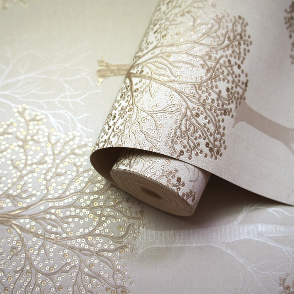 Calculate QuantityOrnella is a new luxury Italian heavy weight vinyl design inspired by elegant embellished fabrics. The opulent stylised tree has a sequin effect emboss and metallic accents that shimmer amongst embroidered branches and a bark effect base. Micas, metallics and glitter help enhance the movement of the emboss and accentuate the detail. Each feature has a coordinating bark texture plain.
