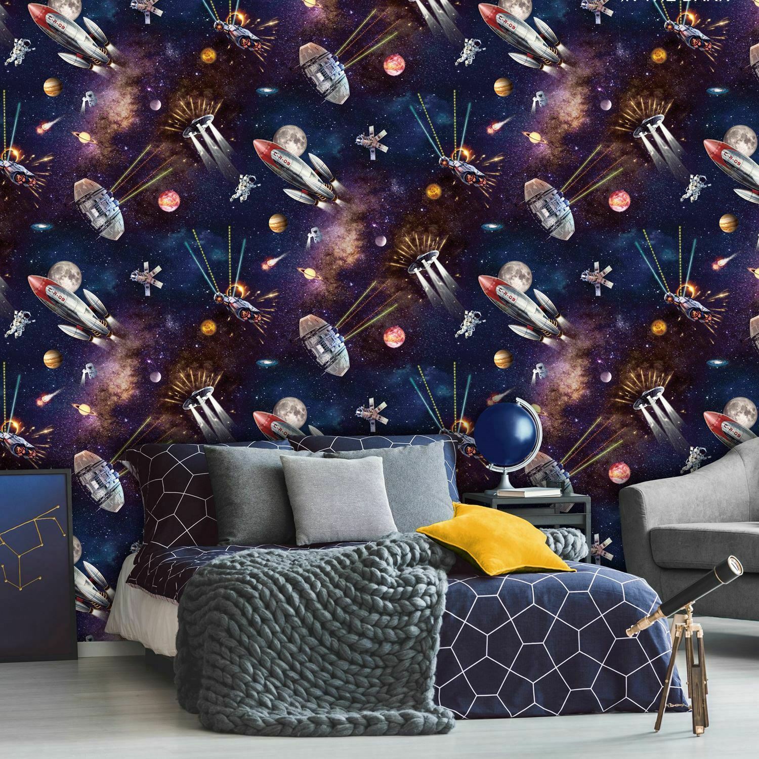 Calculate QuantityThe playroom or bedroom of your child will feel more magical with the addition of this outer space wallpaper. On a deep blue background patterned with sparkling stars, the intricate design shows astronauts, planets, spacecraft, and satellites. Some pieces also have glow-in-the-dark qualities. This premium wallpaper is simple to install, has a smooth finish, and would look fantastic on a feature wall or when used to accent an entire room.