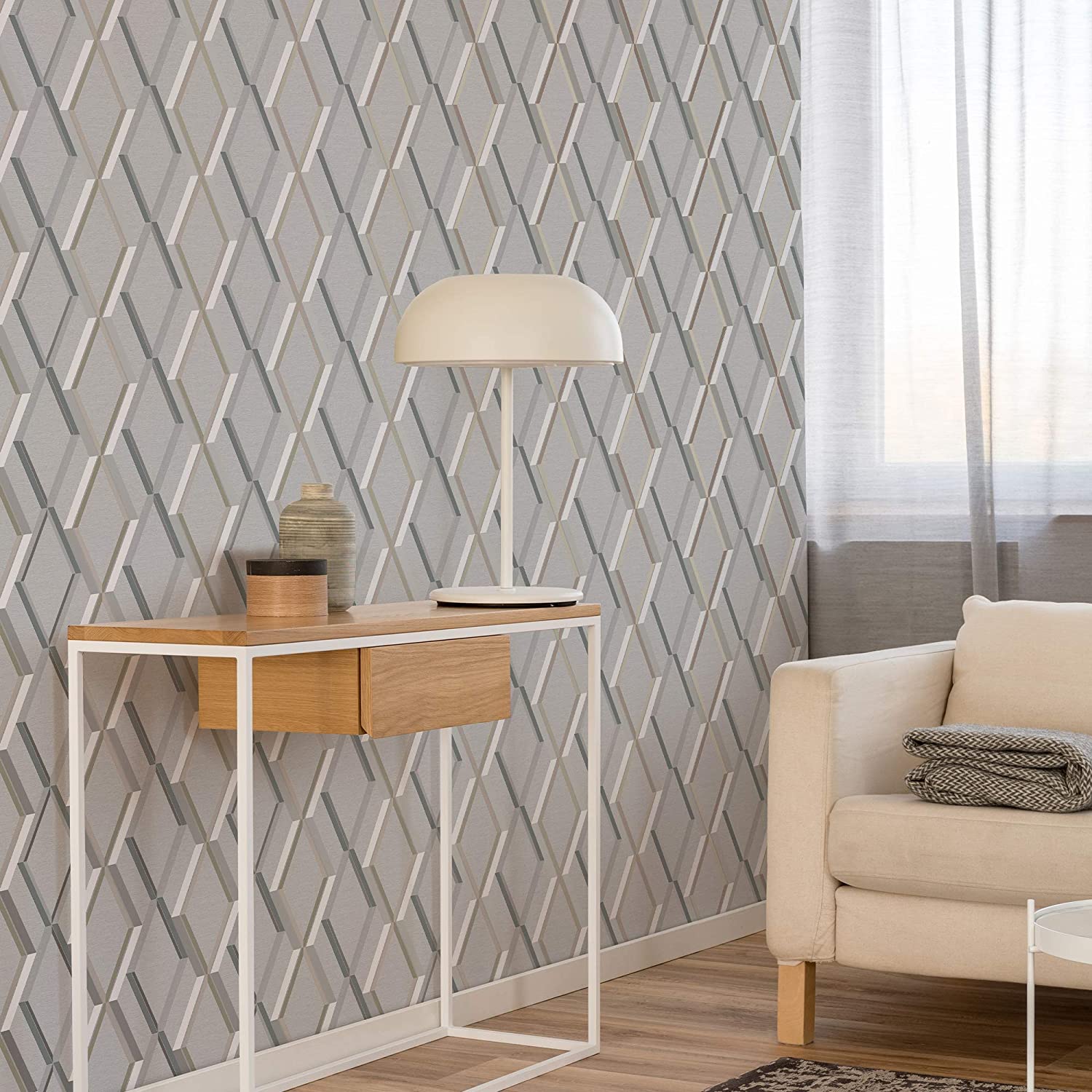 Calculate QuantityThis diamond wallpaper is excellent among most living spaces in your house and can be used to accent a single wall or the entire space. This lovely wallpaper with a tinge of metallic is ideal if you want to give your house a fashionable appearance. To produce this magnificent paper, the geometric pattern is combined with tonal colours and a smooth fabric impression texture.