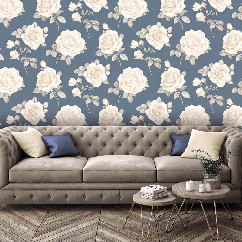 Calculate QuantityBeautiful yet bold, this stunning Rosa wallpaper is perfect for bringing any room to life. Consisting of a charming floral trail design imposed upon a contrasting hessian background, this vintage wallpaper is both simple and easy to apply. Shown in denim blue. Please purchase a sample for true texture.