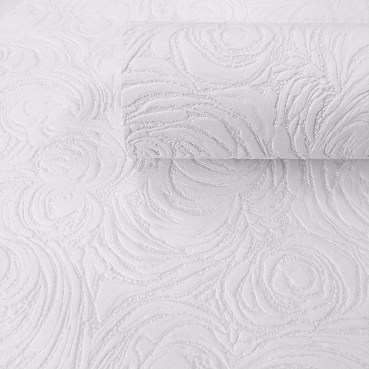 A white swirl rose effect textured wallcovering with a pattern match. Suitable for painting with a colour of your choice. Please purchase a sample for true texture.