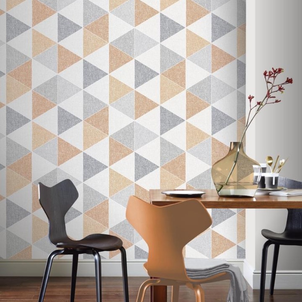 Calculate QuantityThis striking graphic triangle print wallpaper comes in on-trend orange and grey. It's a cool, Scandi-inspired design for a sophisticated home. Its colour palette ensures that it's a key fashion choice, you can team this paper with pale or dark furniture to suit your style. A great feature wall choice, it's also understated enough to be used throughout a room, whether you hang it in a bedroom, living room, dining room or kitchen. Suitable for most rooms except high moisture environments, like bathrooms.