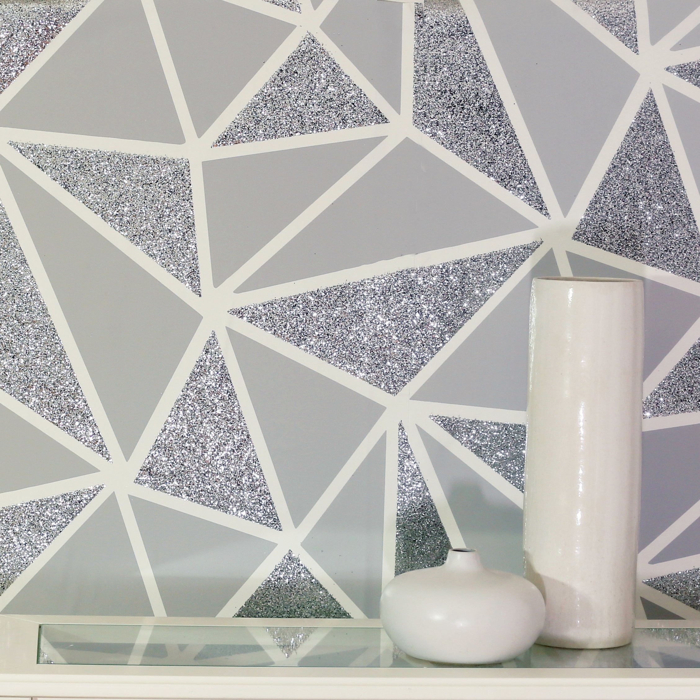 Calculate QuantityThis geometric wallpaper has a thoroughly modern feel. With angular silver shapes contrasting against stunning sequins, it will bring maximum glitz to any space. It really is a paper designed to turn heads. The textured sequin finish really catches and reflects light in every direction, for glamour by day and by night. Paper a single wall or a whole room to achieve the high-end style you desire.