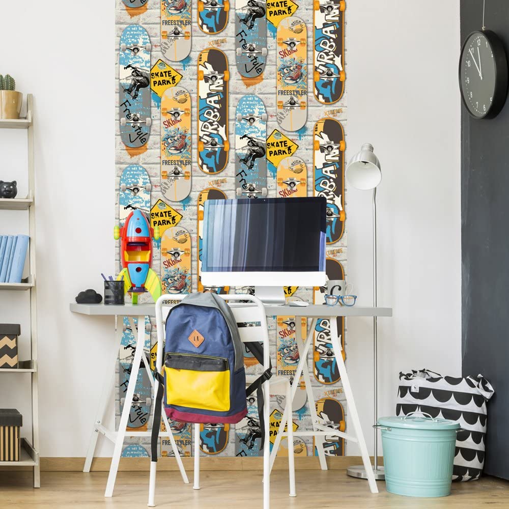 Designed on a modern brick background, skateboards take centre stage all personalised with stickers and graffiti. A great design for a teenager who loves skaters and the street feel. Please purchase a sample for true colour and texture.