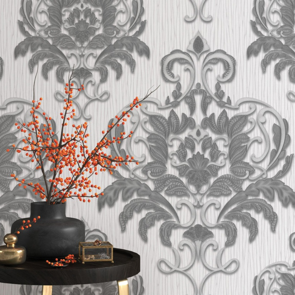 Spotlight Damask White & Silver Vinyl Wallpaper 10102-10