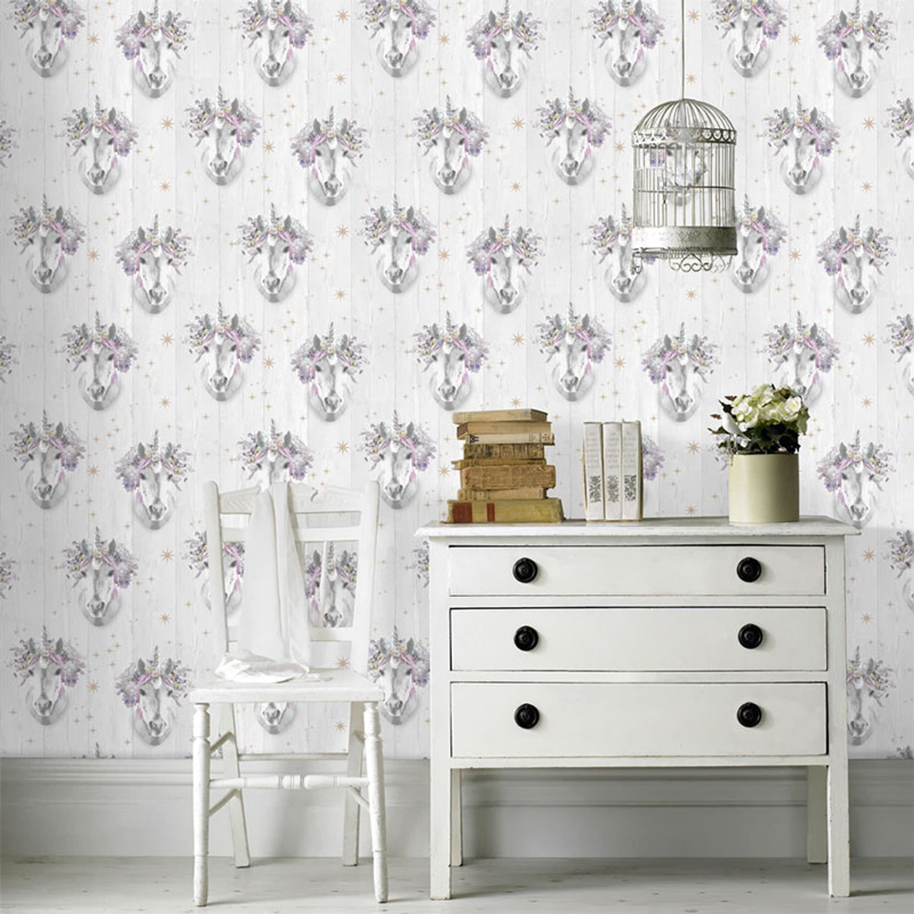 This bold wallpaper features a fantasy unicorn beautifully placed on wooden panel back drop. Easy to apply, this wallpaper will look great when used to decorate a whole room or when used to create a feature wall. Please purchase a sample for true colour and texture.