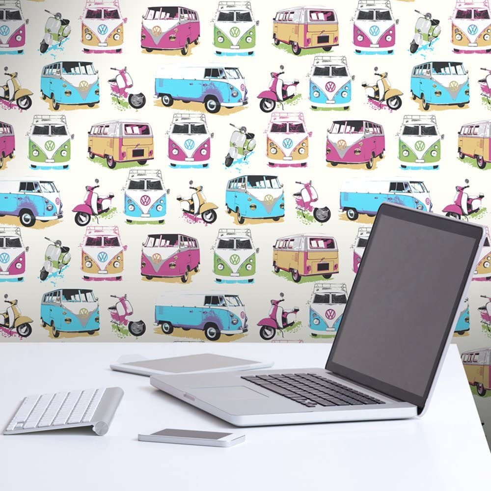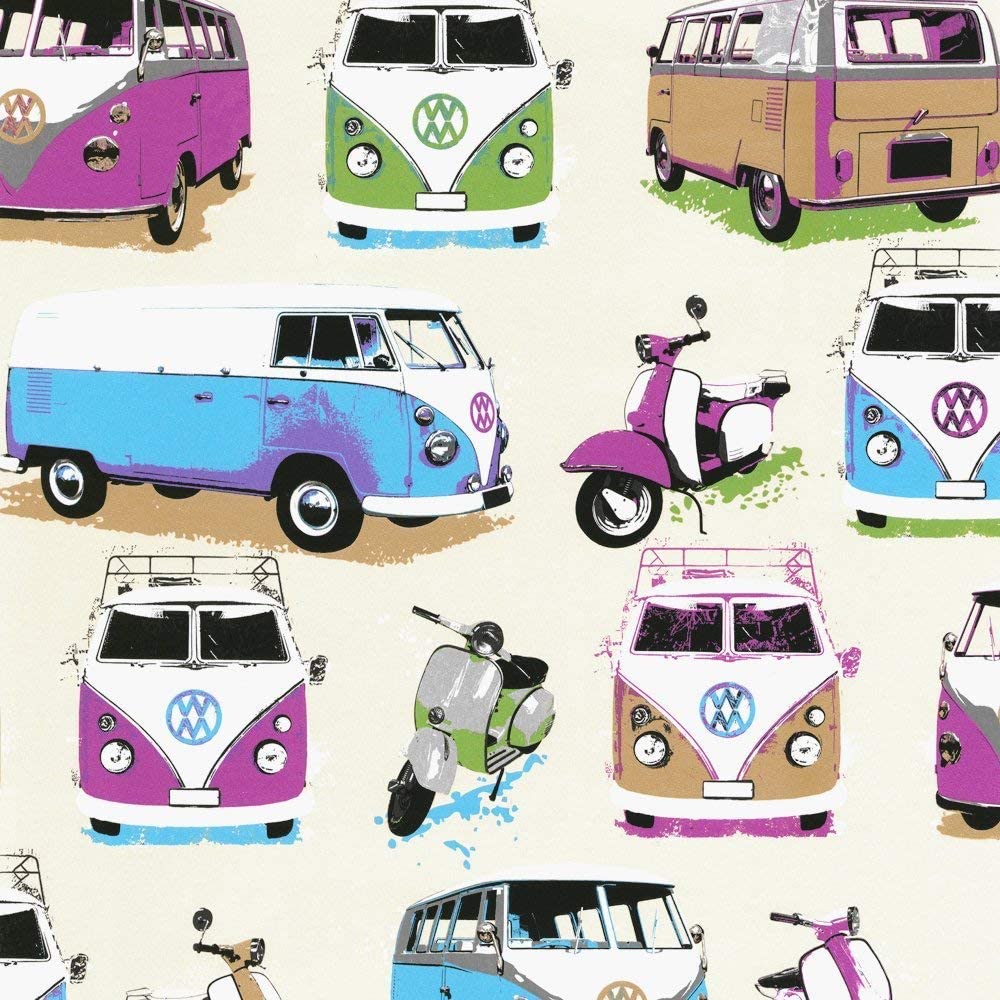 Calculate QuantityUgepa Camper Vans wallpaper is a fun design for a feature wall, Images of VW Camper vans and Scooters. Easy to apply, this high-quality wallpaper will look great when used to decorate a whole room or to create a feature wall. Please purchase a sample for true colour and texture.