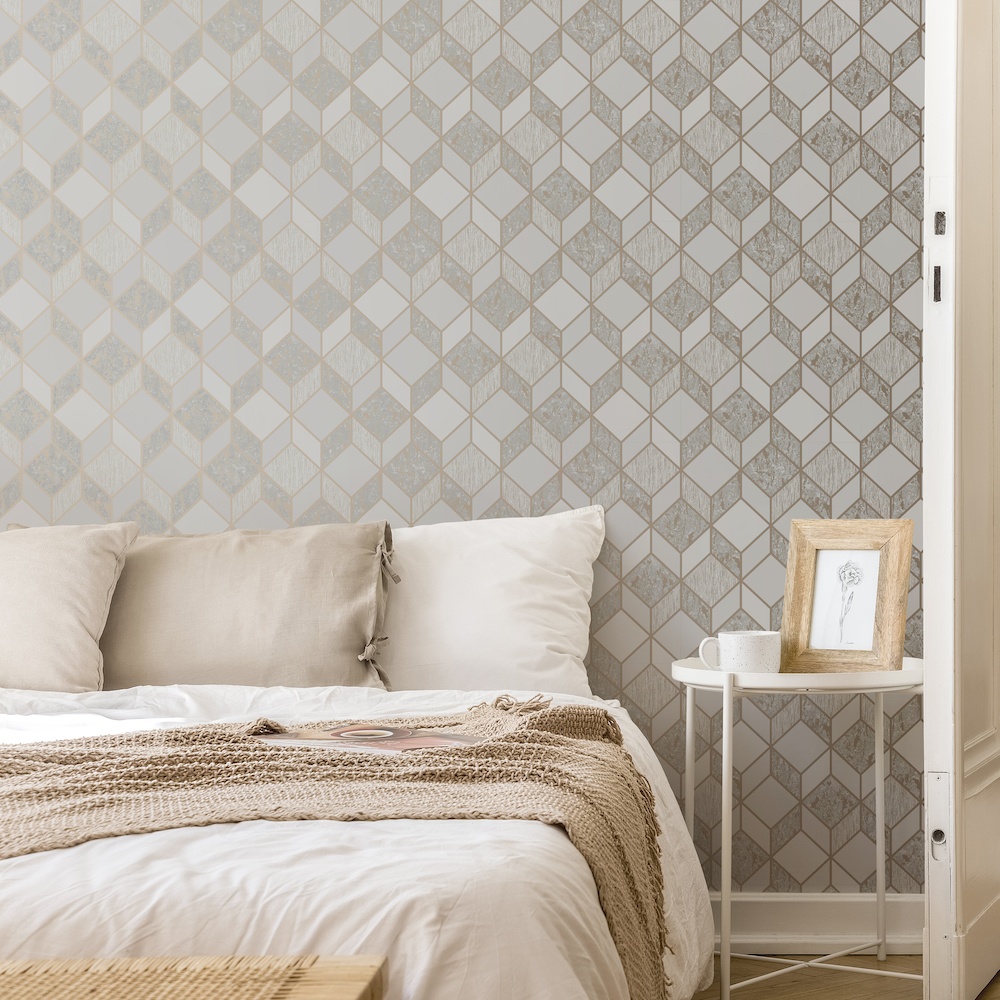 Calculate QuantityYour home will look trendy with this lovely Vittorio Geo wallpaper. The pattern is a modern geometric composition of parallelograms and diamonds that creates the illusion of a 3D cube and is highlighted in a soft metallic gold. This high-quality, simple-to-install wallpaper would look fantastic when used to adorn an entire room or as a highlight wall.