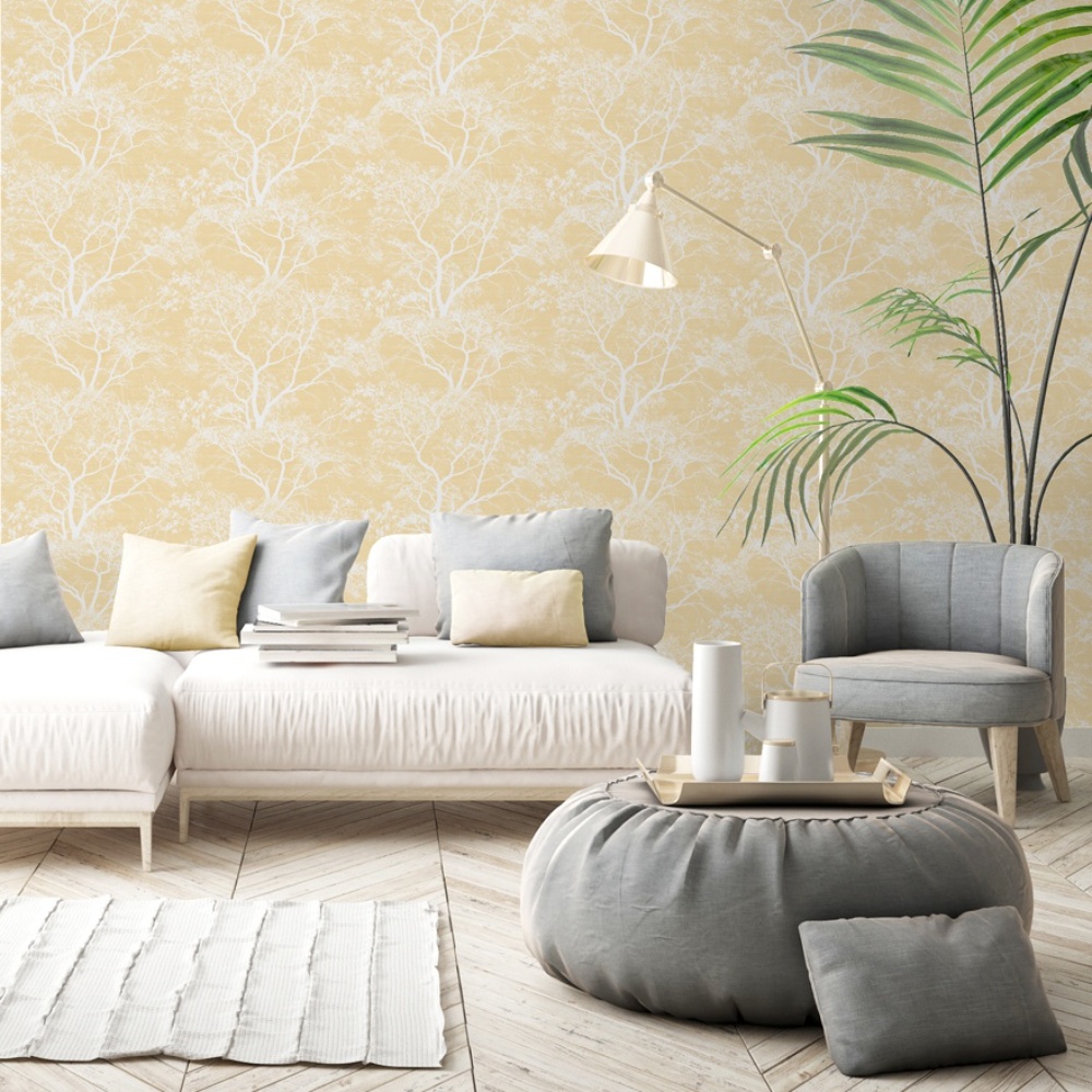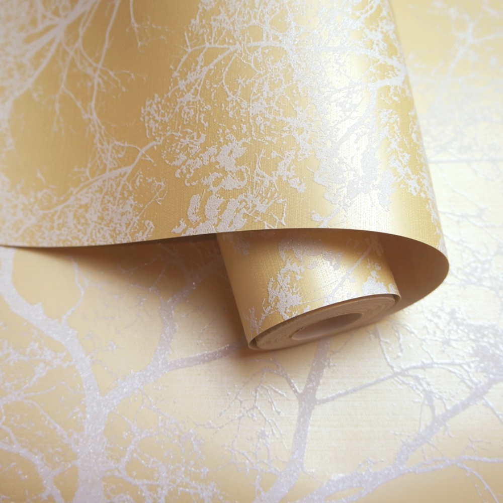 This natural tree print creates an all over textured look, with a raised motif and a shimmering mica textile print in the background.