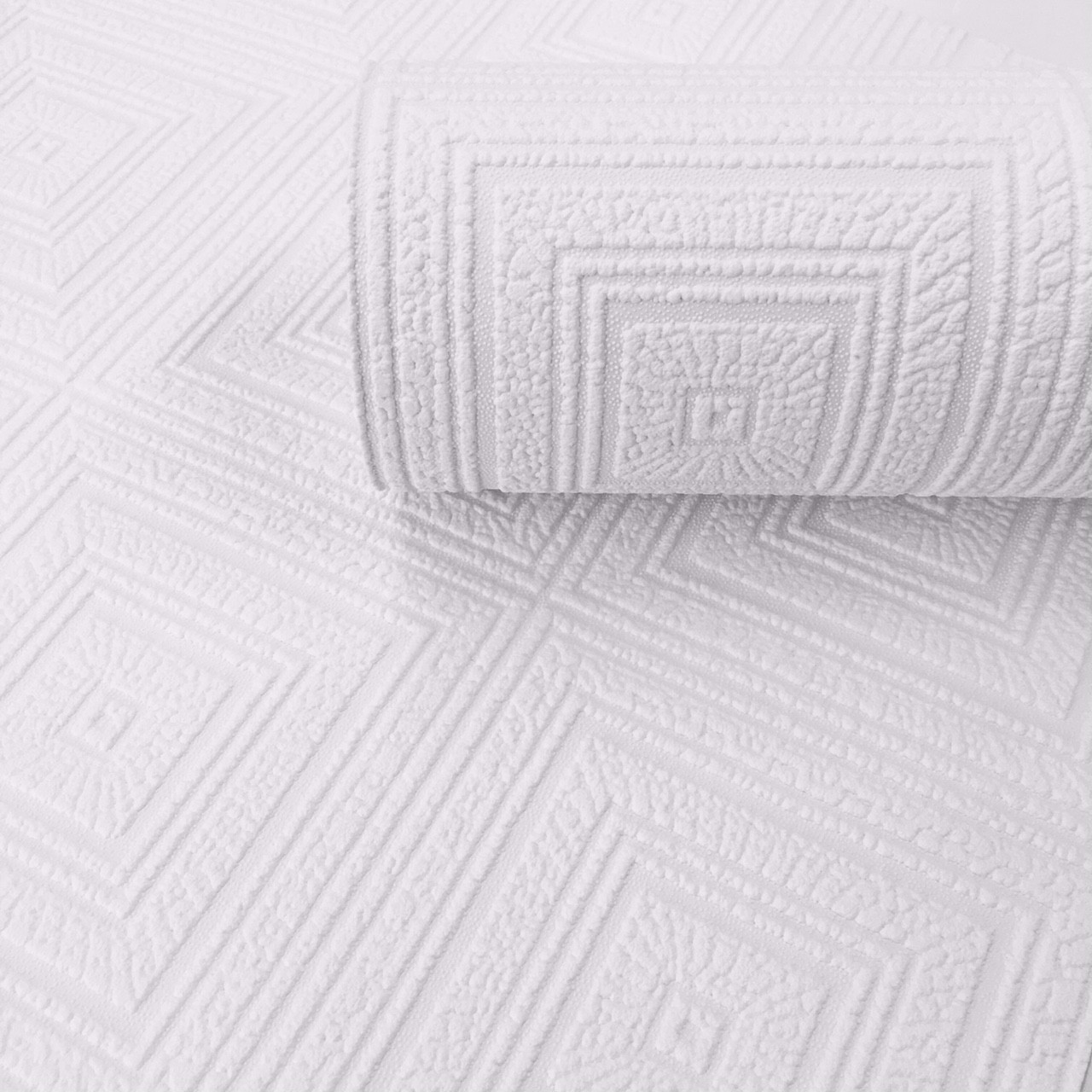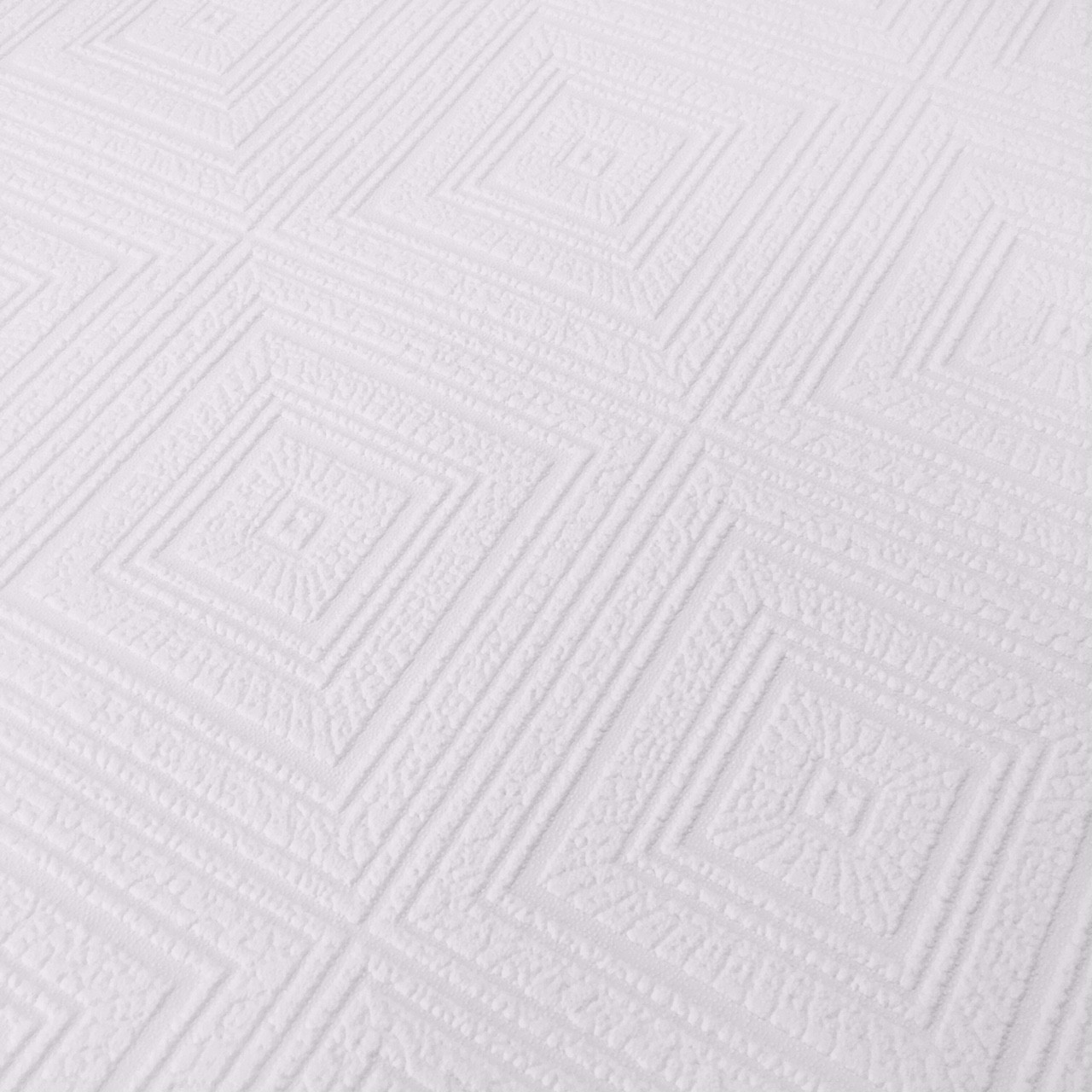 A white square effect textured wallcovering with a small pattern match. Suitable for painting with a colour of your choice. Please purchase a sample for true texture.