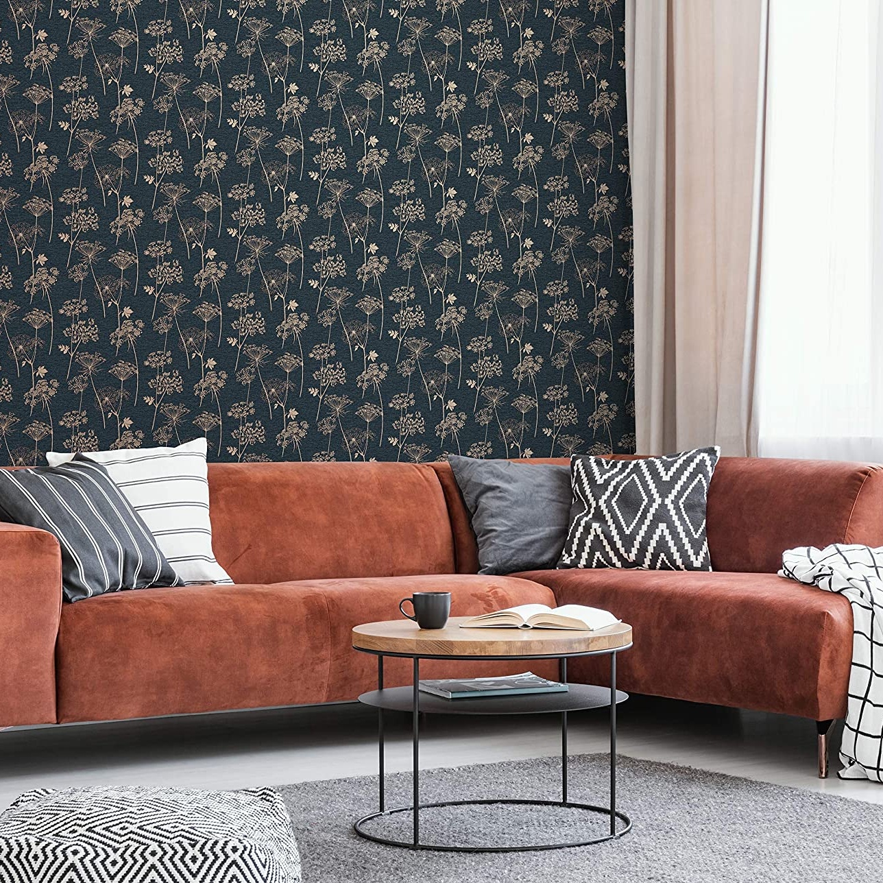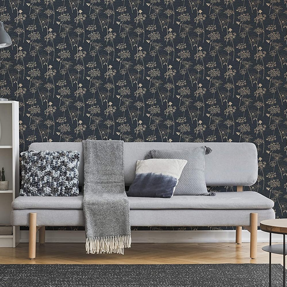 Calculate QuantitySuperfresco Easy Wild Flower, shown here in charcoal. A stunning navy & gold metallic cow parsley and dandelion clocks feature in this beautiful textured wallcovering. The background has a linen effect with subtle tones of gold running throughout the design. Paste the wall always makes it quick and easy to hang. Please purchase a sample for true texture.